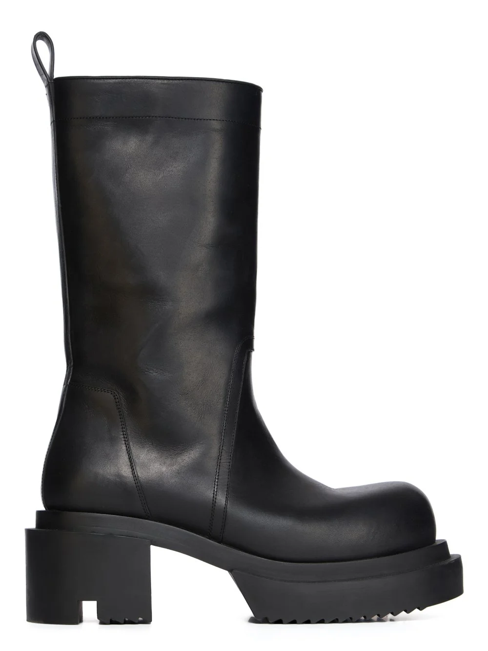 RICK OWENS FW25 CONCORDIANS CALF PULL ON BOGUN IN BLACK GROPPONE COW LEATHER THESE CALF PULL ON BOGUN BOOTS ARE MID CALF HEIGHT. THEY HAVE A PULL ON BOOT UPPER, A TOPSTITCHED SEAM ARCING OVER THE FRONT FOOT AND A STITCHED HEEL COUNTER. IT HAS A BACK PULL TAB AND A ROUNDED TOE. THEY FEATURE A BOGUN RUBBER MEGA CREEPER SOLE WITH A TOOTHED SQUARE HEEL THIS HEAVYWEIGHT COW LEATHER IS VEG TANNED AND FINISHED USING NATURAL WAXES. BECAUSE THIS SKIN IS NAKED, NOT FINISHED USING ANY PIGMENTS COVERING THE SKIN, NATURAL MARKINGS AND SHADINGS ARE VISIBLE WHICH MAKES EACH SKIN AND PRODUCT UNIQUE VEG TANNING MEANS ONLY VEGETAL AND NATURAL TANNINS WERE USED IN THE PROCESS OF TANNING AND PRESERVING THIS LEATHER THIS TANNERY IS LWG CERTIFIED WITH A GOLD RATING COLOR: BLACK MATERIAL: UPPER 100% COW LEATHER LINING 100% CALF LEATHER INSOLE 100% CALF LEATHER SOLE 100% THERMOPLASTIC POLYURETHANE SOLE AT HEEL 6CM - SOLE AT TOE 3CM
