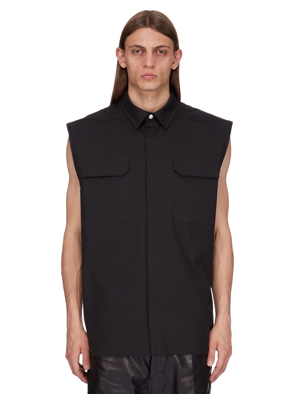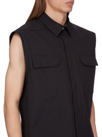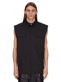 RICK OWENS SS25 HOLLYWOOD JUMBO SL OUTERSHIRT IN BLACK HEAVY COTTON POPLIN THIS JUMBO SL OUTERSHIRT IS BELOW-HIP LENGTH AND SLEEVELESS WITH A JUMBO BOXY FIT. IT HAS A CLASSIC COLLAR AND VISIBLE SNAP FRONT CLOSURES, BEVELED SIDE SEAMS AND DOUBLE TOPSTITCHING. IT FEATURES SIGNATURE LEVEL SHOULDER SEAMS AND A COTTON WEBBING STRAP WITH RIVET DETAIL ON THE BACK YOKE THIS MEDIUMWEIGHT COTTON POPLIN HAS A CRISP HANDFEEL AND WASHED FINISH THIS FABRIC IS MADE USING GOTS CERTIFIED ORGANIC COTTON WHICH MEANS THE NATURAL FIBER IS GROWN WITHOUT HARMFUL CHEMICALS, LEAVING OUR SOIL, AIR AND WATER CLEANER FROM CONTAMINATES COLOR: BLACK MATERIAL: 97% COTTON + 3% ELASTANE MODEL IS 189CM TALL MODEL WEARS SIZE 48