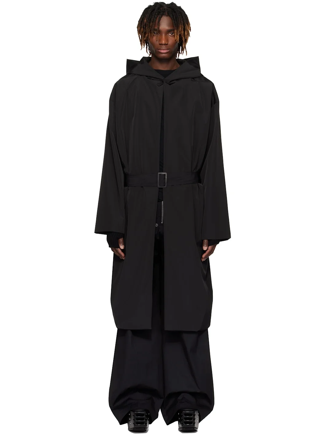 Polyester taffeta coat. · Press-stud fastening at hood · Shawl collar · Open front · Detachable pin-buckle belt · Seam pockets · Dropped shoulders · Zip pockets at interior · Full plain-woven lining Supplier color: Black Body: 100% polyester. Lining 1: 100% cotton. Lining 2: 100% cupro. Made in Italy 251232M176001