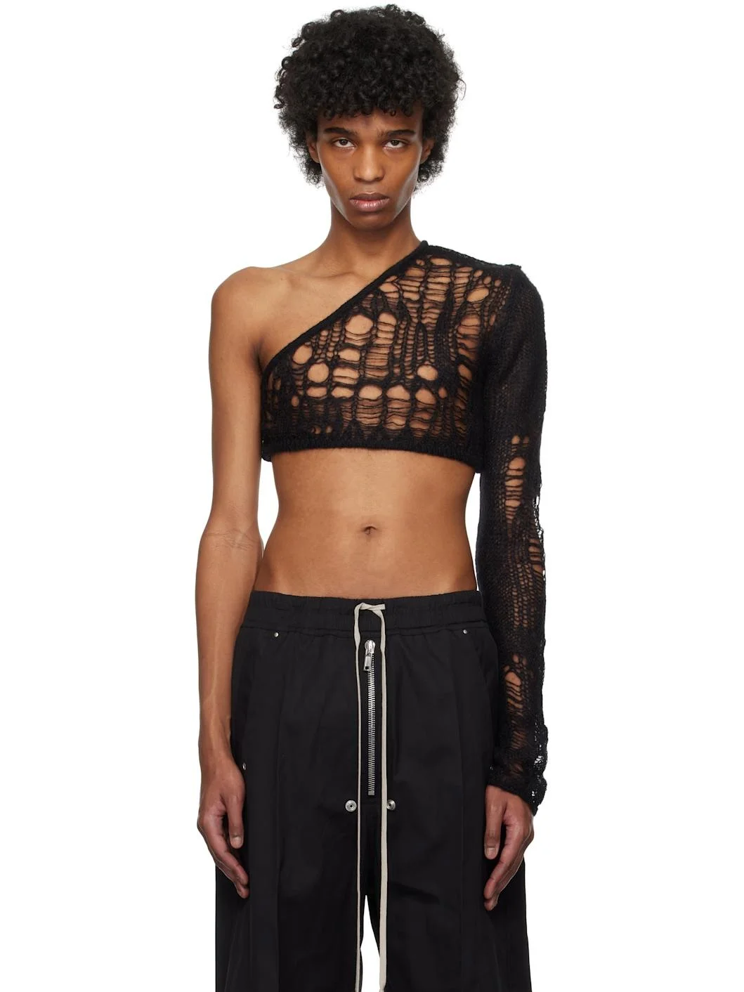 Sheer open-knit nylon- and mohair-blend sweater. · Laddering throughout · Single-shoulder construction Supplier color: Black 50% polyamide, 46% mohair, 4% wool. Made in Italy 251232M201006