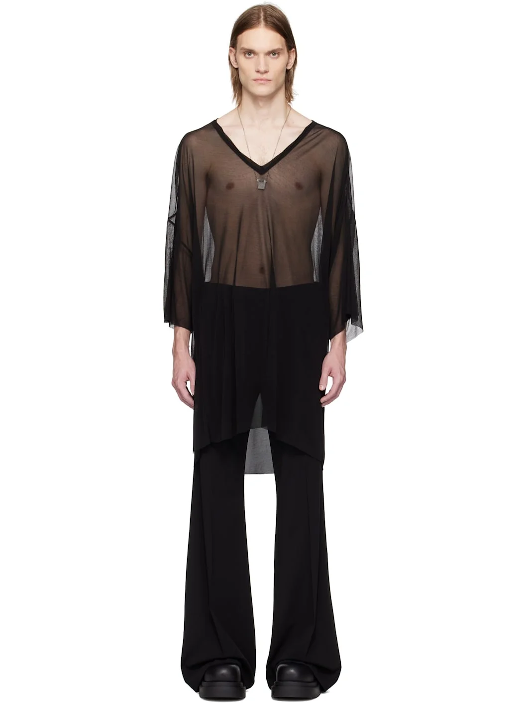 Sheer viscose jersey T-shirt. · Plunging V-neck · Raw edge at hem and cuffs · Saddle shoulders Supplier color: Black 100% viscose. Made in Italy 251232M213143