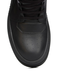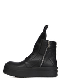 RICK OWENS SS26 TEMPLE MEGA BUMPER GEOBASKET IN ALL BLACK FULL GRAIN CALF LEATHER THESE MEGA BUMPER GEOBASKETS ARE ABOVE-ANKLE HEIGHT. THEY FEATURE AN EXTENDED TONGUE WITH WEBBING TAB, SIGNATURE GEOMETRIC PANELS AND A PADDED BACK COUNTER WITH LINES OF TOPSTITCHING. THEY HAVE 7 EYELETS WITH CONTRAST LACES, A ZIPPER ON THE INSIDE ANKLE FOR EASY FASTENING AND DOUBLE HEIGHT, SHARK-TOOTHED MEGA BUMPER SOLES. THIS MEDIUMWEIGHT FULL GRAIN CALF LEATHER HAS A FLAT AND MATTE SURFACE FINISH AND IS SPECIFICALLY TANNED FOR SHOES WITH AN ABRASION-RESISTANT FINISH. THIS TANNERY IS LWG CERTIFIED WITH A BRONZE RATING. COLOR: ALL BLACK MATERIAL:UPPER 100% COW LEATHER LINING 100% CALF LEATHER INSOLE 100% CALF LEATHER SOLE 100% THERMOPLASTIC RUBBER SOLE HEIGHT 4.5CM