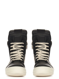 RICK OWENS SS26 TEMPLE GEOBASKET IN BLACK/MILK/MILK FULL GRAIN COW LEATHER THESE GEOBASKETS ARE ABOVE-ANKLE HEIGHT. THEY FEATURE AN EXTENDED TONGUE WITH WEBBING TAB, SIGNATURE GEOMETRIC PANELS AND A PADDED BACK COUNTER WITH LINES OF TOPSTITCHING. THEY HAVE CONTRAST LACES, A ZIPPER ON THE INSIDE ANKLE FOR EASY FASTENING AND SHARK-TOOTHED BUMPER SOLE THIS MEDIUMWEIGHT FULL GRAIN COW LEATHER HAS A FLAT AND MATTE SURFACE FINISH AND IS SPECIFICALLY TANNED FOR SHOES WITH AN ABRASION-RESISTANT FINISH THIS TANNERY IS LWG CERTIFIED WITH A BRONZE RATING COLOR: BLACK/MILK/MILK MATERIAL: UPPER 100% COW LEATHER LINING 100% CALF LEATHER INSOLE 100% CALF LEATHER SOLE 100% THERMOPLASTIC RUBBER SOLE HEIGHT 3.5CM