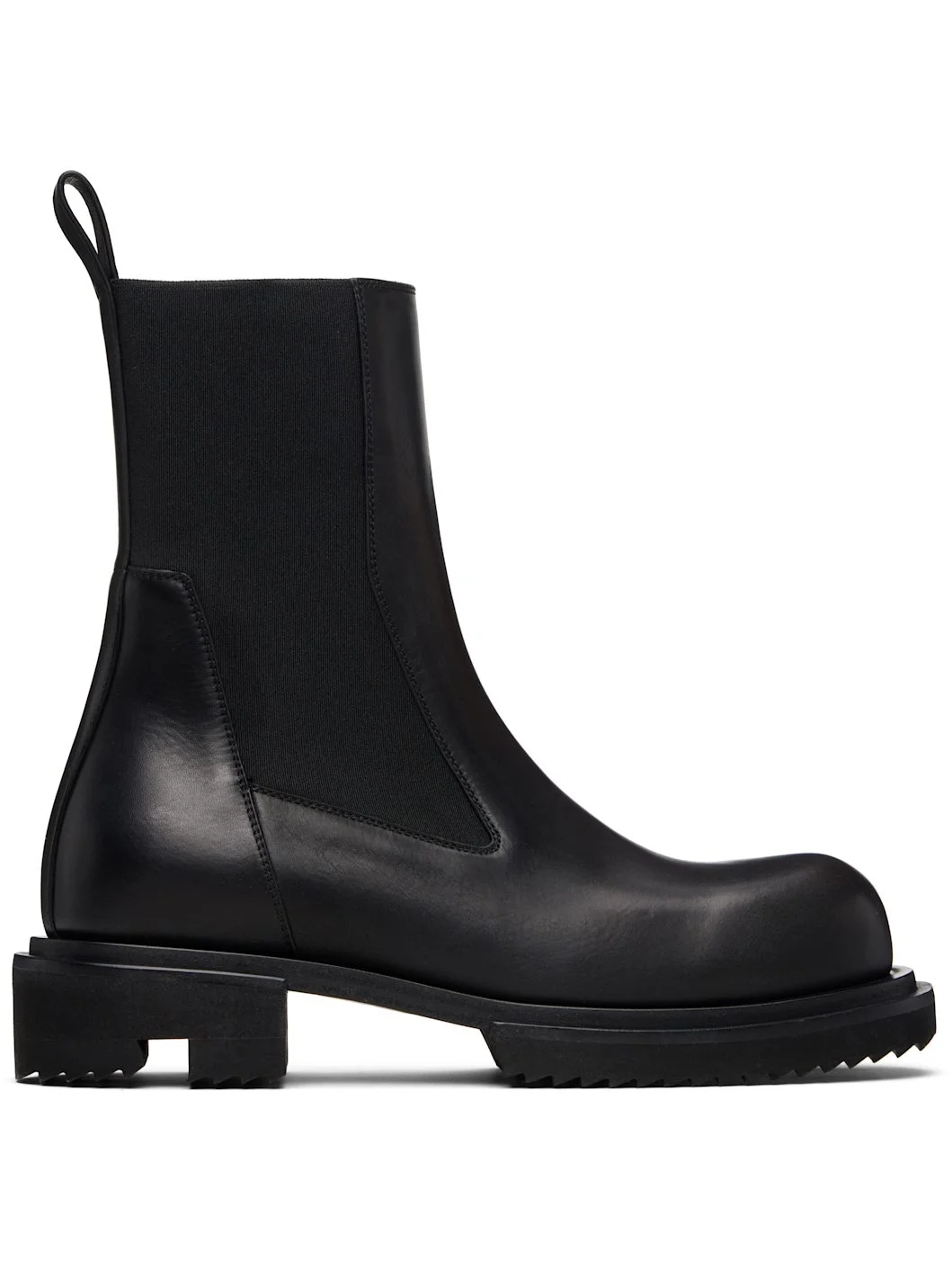 Ankle-high vegetable-tanned buffed leather boots. · LWG-certified leather · Rigid toe · Elasticized gusset and collar · Pull-loop at heel collar · Leather lining · Treaded lightweight foam rubber sole · Heel: H1.75" Supplier color: Black Upper: leather. Sole: rubber. Made in Italy 261232M223010