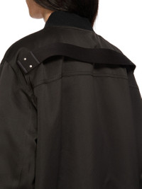 RICK OWENS SS26 TEMPLE CLASSIC FLIGHT IN BLACK TECH DUCHESSE THIS CLASSIC FLIGHT IS HIP LENGTH WITH LONG SLEEVES. IT HAS A CENTER FRONT ZIP WITH PLACKET AND TOP SNAP, SIDE FRONT SLIT POCKETS WITH DOUBLE SNAPS, A ZIPPED UTILITY POCKET IN THE LEFT FOREARM AND A RIBBED COLLAR, CUFFS AND HEM. IT FEATURES A COTTON WEBBING STRAP WITH RIVET DETAIL ON THE BACK YOKE. IT IS FULLY LINED WITH TWO INTERNAL ZIPPED POCKETS. THIS MEDIUMWEIGHT TECHNICAL DUCHESSE SATIN HAS A SHINY SURFACE AND CRISP HANDFEEL. THIS FABRIC IS MADE USING GRS CERTIFIED RECYCLED POLYESTER WHICH ENSURES A REDUCTION IN WATER CONSUMPTION, EMISSIONS AND HAZARDOUS WASTE, LESSENING THE DEPENDENCE ON NON-RENEWABLE RESOURCES. COLOR: BLACK MATERIAL:100% POLYESTER KNIT RIB COLLAR, WRIST BAND AND BOTTOM 92% NEW WOOL + + 6% NYLON + 2% ELASTANE BODY AND POCKETS LINING 100% COTTON SLEEVES LINING 100% CUPRO PADDING 100% POLYESTER MODEL IS 189CM TALL MODEL WEARS SIZE 54