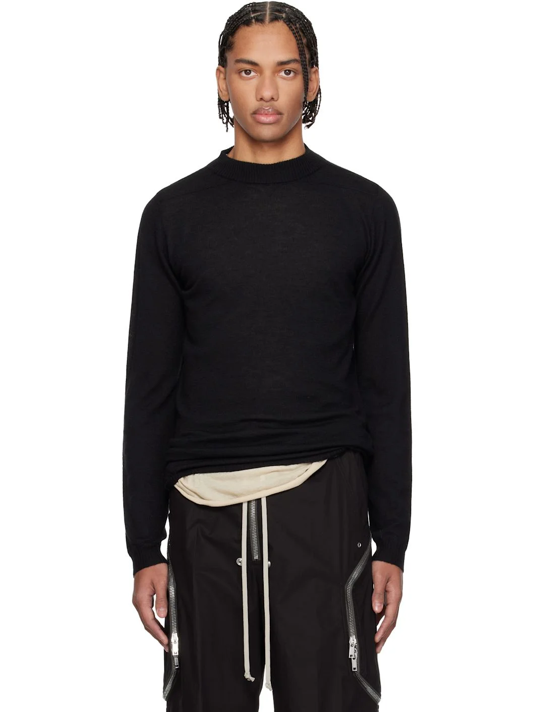 Lightweight knit cashmere sweater. · Rib-knit mock neck, hem, and cuffs · Offset seam at shoulders · Central garter-stitch stripe at back Supplier color: Black 100% cashmere. Made in Italy 261232M201027