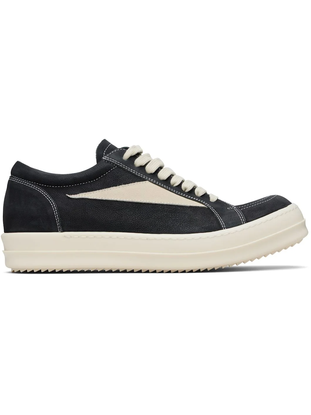 Low-top calfskin suede sneakers. · LWG-certified calfskin · Lace-up closure · Padded collar · Suede applique at sides · Grained calfskin lining · Treaded rubber sole · Contrast stitching in white Supplier color: Black/Milk/Milk Upper: leather. Sole: rubber. Made in Italy 261232M237046
