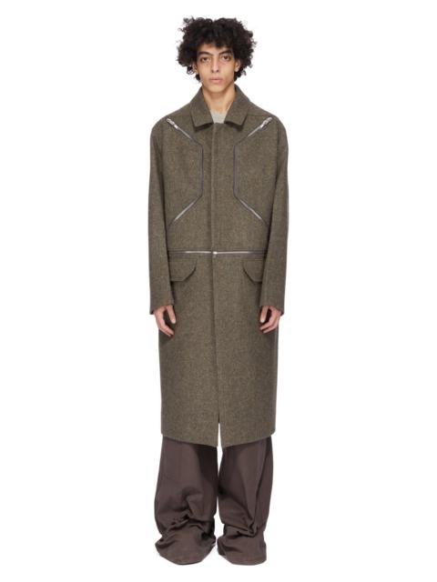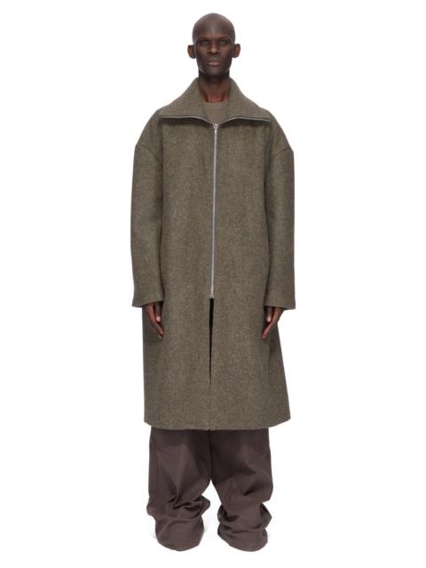 RICK OWENS FW25 CONCORDIANS RUNWAY BLIXA JUMBO MAC IN BLACK MELTON THIS BLIXA JUMBO MAC IS BELOW KNEE LENGTH WITH LONG SLEEVES AND A SQUARE FIT. IT HAS A CLASSIC COLLAR AND A CENTRE ZIPPER OPENING, BLIXA TWO-WAY ZIPPERED CHEST POCKETS AND TWO LOWER FLAP POCKETS ON FRONT AS WELL AS THE HARNESS DETAIL ON FRONT CHEST. IT FEATURES THE IT FEATURES A ZIP HEM, ALLOWING PIECES TO BE CONVERTED INTO LONGER OR SHORTER GARMENTS. THIS BLIXA JUMBO MAC IS COAT LENGTH BUT CAN BE UNZIPPED INTO A CROPPED PIECE. THE ZIPS CAN ALSO BE PARTIALLY UNDONE, ALLOWING THE BOTTOM HALF TO DRAPE BEHIND. IT HAS A CENTRE BACK VENT. IT IS FULLY LINED WITH TWO INTERNAL ZIPPERED POCKETS. THIS VERSION HAS CONTRAST LEATHER TOP AND VIRGIN WOOL LOWER HALF THIS HEAVYWEIGHT AND COMPACT WOOL MELTON HAS A FLAT, MATTE FINISH AND A SOFT HANDFEEL COLOR: BLACK MATERIAL:100% NEW WOOL MODEL IS 189CM TALL MODEL WEARS SIZE 48