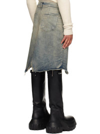 Slub 14 oz non-stretch organic cotton denim midi skirt. · GOTS- and ZDHC-certified · Stonewashed · Fading and whiskering throughout · Belt loops · Four-pocket styling · Button fly · Central vent at front and back · Raw edge at hem Supplier color: Dirty hustler Body: 100% cotton. Trim: 52% polyester, 48% cotton. Made in Italy 252232M193012