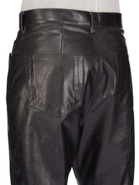 RICK OWENS SS25 HOLLYWOOD BOLAN BOOTCUT IN BLACK TAMPONATO CALF LEATHER THIS BOLAN BOOTCUT IS A HIGH WAISTED, SLIM FIT, 5 POCKET JEAN WITH A FLOOR-LENGTH BOOT CUT. THEY HAVE A CONCEALED BUTTON FLY AND A WAISTBAND WITH CENTER BUTTON, BELT LOOPS AND POCKET RIVETS AND BACK PATCH POCKETS WITH TOPSTITCHING THIS MEDIUMWEIGHT CALF LEATHER HAS A SMOOTH AND MATTE SURFACE. IT IS FINISHED WITH A TECHNIQUE CALLED TAMPONATURA WHICH MEANS THE BLACK COLOR AND WAX IS APPLIED AFTER THE SKIN HAS BEEN TANNED AND DYED. THE BLACK LAYER WILL THEN RUB OFF WITH WEAR AND ABRASION GIVING EACH GARMENTS ITS OWN UNIQUE LOOK.THE NATURAL ASPECTS OF THIS MATERIAL MEANS THE BLACK COLOR HAS FADED IN CERTAIN AREAS, EXPOSING THE UNDERLYING NATURAL COLOR AND WILL CONTINUE TO DO SO WITH WEAR AND ABRASION. THIS LEATHER IS MADE BY A THIRD GENERATION FAMILY OWNED TANNERY IN THE SOUTH OF ITALY. COLOR: BLACK MATERIAL: 100% CALF LEATHER LINING 100% COTTON MODEL IS 189CM TALL MODEL WEARS SIZE 29