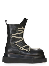 RICK OWENS FW24 PORTERVILLE PENTALACED TURBO CYCLOPS IN BLACK/PEARL WASHED CALF THESE PENTALACED TURBO CYCLOPS BOOTS ARE MID-CALF HEIGHT. THEY HAVE ANGLED TOPSTITCHED PANELS AND A ZIPPER ON THE OUTER LEG FOR EASY FASTENING AND A PULL TAB AT BACK. THEY FEATURE A PENTALACING AND HIGH GEOMETRIC TONGUE. THEY HAVE A ROUNDED TOE, AND FEATURE A TURBO CYCLOPS SOLE WITH A RUBBER MEGA CREEPER SOLE LAYERED ATOP A WIDER SQUARE TOED SOLE BELOW. AND A RUBBER CYCLOPS MEGA CREEPER SOLE THIS MEDIUMWEIGHT COW LEATHER IS VEG TANNED AND FINISHED USING NATURAL WAXES. A FINAL WASH GIVES THIS LEATHER ITS SOFTNESS AND BRINGS OUT THE NATURAL GRAIN TEXTURE OF EACH SKIN. BECAUSE THIS SKIN IS NAKED, NOT FINISHED USING ANY PIGMENTS COVERING THE SKIN, NATURAL MARKINGS AND SHADINGS ARE VISIBLE WHICH MAKES EACH SKIN AND PRODUCT UNIQUE. VEG TANNING MEANS ONLY VEGETAL AND NATURAL TANNINS WERE USED IN THE PROCESS OF TANNING AND PRESERVING THIS LEATHER. - COLOR: BLACK/PEARL - MATERIAL: UPPER 100% CALF LEATHER - LINING 100% CALF LEATHER - INSOLE 100% CALF LEATHER - MID SOLE 100% COW LEATHER - SOLE 100% E.V.A