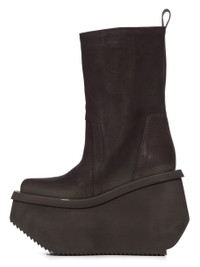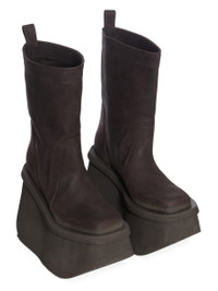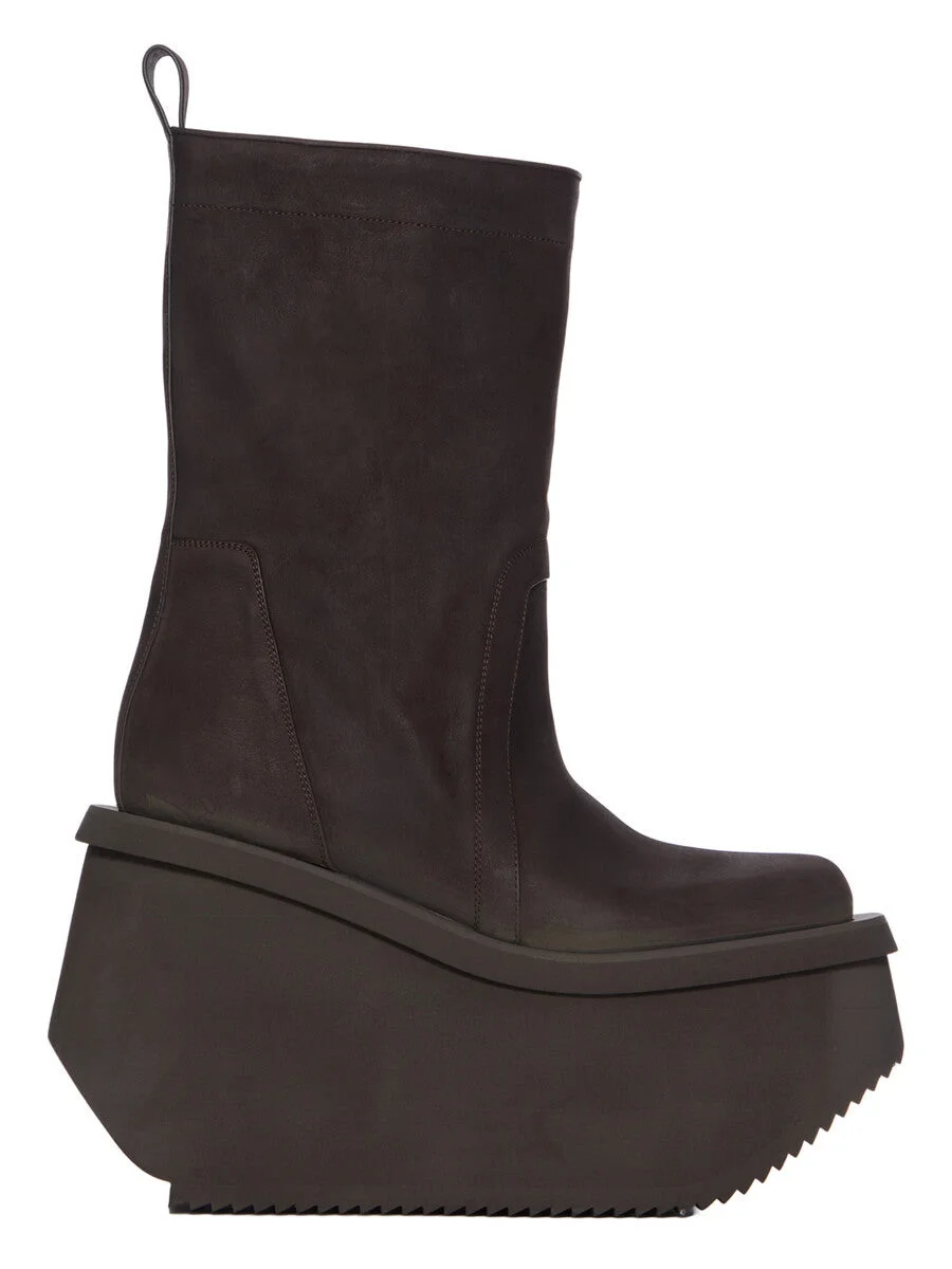 RICK OWENS FW25 CONCORDIANS RUNWAY FACTORY BOOTS IN BROWN NUBUCK THESE FACTORY BOOTS ARE MID-CALF HEIGHT. THEY HAVE A TOPSTITCHED SEAM ARCING OVER THE FRONT FOOT WITH STITCHING RUNNING OVER THE ANTERIOR ANKLE. THEY FEATURE AN ANGULAR HEEL COUNTER AND A BACK LOOP PULL TAB AND HAVE 14CM HIGH SHARK-TOOTH SOLE UNDERNEATH AND AT FRONT AND HAVE A SLANTING HEEL AND INCLINED TOE PLATFORM. THIS HEAVYWEIGHT BULL LEATHER HAS A BRUSHED NUBUCK FINISH AND WAXY HANDFEEL. BECAUSE THIS SKIN IS NAKED, NOT FINISHED USING ANY PIGMENTS COVERING THE SKIN, NATURAL MARKINGS AND SHADINGS ARE VISIBLE WHICH MAKES EACH SKIN AND PRODUCT UNIQUE. THIS TANNERY IS LWG CERTIFIED WITH A SILVER RATING. COLOR: BROWN MATERIAL: UPPER 100% CALF LEATHER LINING 100% CALF LEATHER INSOLE 100% CALF LEATHER PLATFORM AT HEEL 14CM PLATFORM AT TOE 7CM