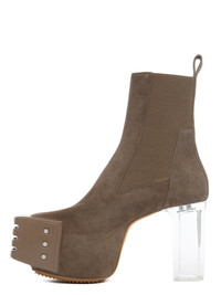 RICK OWENS FW22 STROBE GRILLED PLATFORMS IN DUST GREY CROSTA SUEDE LEATHER THESE GRILLED PLATFORMS ARE ABOVE-ANKLE HEIGHT, THEY HAVE ELASTIC SIDE PANELS, TOPSTITCHING AND A BACK PULL-TAB. THEY FEATURE A 10CM TRANSPARENT HEEL, A THICK FRONT PAINTED PLATFORM AND A GRILLED BEVEL SECURED WITH SILVER RIVETS ON FRONT THIS HEAVYWEIGHT SUEDE LEATHER HAS A WAXY HANDFEEL - COLOR: DUST/ CLEAR HEEL - MATERIAL: UPPER 100% COW LEATHER - LINING 100% CALF LEATHER - INSOLE 100% CALF LEATHER - SOLE 100% COW LEATHER - SOLE DETAIL 100% THERMOPLASTIC POLYURETHANE