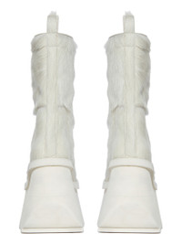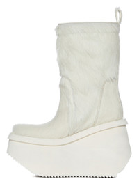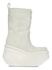 RICK OWENS FW25 CONCORDIANS RUNWAY FACTORY BOOTS IN MILK UNSHAVED COW LEATHER THESE FACTORY BOOTS ARE MID-CALF HEIGHT. THEY HAVE A TOPSTITCHED SEAM ARCING OVER THE FRONT FOOT WITH STITCHING RUNNING OVER THE ANTERIOR ANKLE. THEY FEATURE AN ANGULAR HEEL COUNTER AND A BACK LOOP PULL TAB AND HAVE 14CM HIGH SHARK-TOOTH SOLE UNDERNEATH AND AT FRONT AND HAVE A SLANTING HEEL AND INCLINED TOE PLATFORM. THIS HEAVYWEIGHT LEATHER IS A HAIR-ON COWHIDE WITH NATURAL LENGTH COARSE HAIR. THIS LEATHER IS TANNED IN THE VENETO AREA OF ITALY BY A TANNERY SPECIALIZED IN HAIR-ON COW LEATHER. BECAUSE THE HAIR IS NATURAL THERE CAN BE INCONSISTENCY IN THE LENGTH DIRECTION, TEXTURE AND COLOR. THIS COLOR IS ACHIEVED BY BLEACHING THE NATURAL COW HAIR. VARIATIONS IN COLOR AND ESPECIALLY YELLOW SHADINGS CAN BE PRESENT DUE TO NATURAL URINE STAINS. THIS MEANS NO TWO PRODUCTS ARE EXACTLY ALIKE, GIVING EACH ITS INDIVIDUAL UNIQUENESS. THIS IS NOT TO BE CONSIDER DEFECT BUT IS THE VISUAL ASPECTS DESIRED SPECIFICALLY BY RICK OWENS. THIS TANNERY IS LWG CERTIFIED WITH A SILVER RATING. COLOR: MILK MATERIAL: 100% COW REAL FUR LINING 100% CALF LEATHER INSOLE 100% CALF LEATHER PLATFORM AT HEEL 14CM PLATFORM AT TOE 7CM
