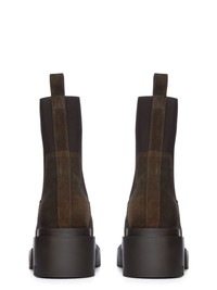 RICK OWENS FW25 CONCORDIANS RUNWAY BEATLE BOGUN IN INDIGO SUEDE THESE BEATLE BOGUN BOOTS ARE ABOVE-ANKLE HEIGHT. THEY HAVE GEOMETRIC SIDE PANELS IN STRETCH ELASTIC, AN ANGULAR HEEL COUNTER WITH TOP STITCHING AND A BACK LOOP PULL TAB. THEY HAVE A ROUNDED TOE AND FEATURE A BOGUN RUBBER MEGA CREEPER SOLE WITH A TOOTHED SQUARE HEEL THIS MEDIUMWEIGHT CROSTA COW SUEDE LEATHER IS MATTE WITH A HAIRY SURFACE TEXTURE. IT IS DYED USING NATURAL INDIGO AND WASHED SEVERAL TIMES TO ACHIEVE ITS FINAL LOOK. IT HAS A NATURAL AND WAXY HAND FEEL ACHIEVED BY DRUMMING THE SKINS WITH WAX SINCE THE INDIGO USED TO DYE THIS LEATHER IS NATURAL, SHADINGS AND COLOR VARIATIONS WILL BE PRESENT. THE COLOR WILL CONTINUE TO EVOLVE AND CHANGE WITH WEAR AND AS IT GET EXPOSED TO LIGHT AND HUMIDITY THIS TANNERY IS LWG CERTIFIED WITH A GOLD RATING COLOR: INDIGO MATERIAL: UPPER 100% COW LEATHER LINING 100% CALF LEATHER INSOLE 100% CALF LEATHER SOLE AT HEEL 6CM SOLE AT TOE 3CM