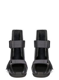RICK OWENS SS24 LIDO RUNWAY LOW SPLINT SANDAL IN BLACK/BLACK GROPPONE COW LEATHER THESE LOW SPLINT SANDALS ARE ABOVE-ANKLE HEIGHT. THEY HAVE A RIGID FOAM OUTER THAT WRAPS THE SIDES OF THE FOOT AND AROUND THE BACK LEG AND ANKLE. THEY HAVE A ROUNDED CENTRE BACK CUT OUT, THAT IS SECURED IN PLACE WITH ADJUSTABLE WEBBING STRAPS. THEY HAVE AN OPEN FRONT AND FEATURES A SHARK-TOOTHED SOLETHIS HEAVYWEIGHT COW LEATHER IS VEG TANNED AND FINISHED USING NATURAL WAXES. BECAUSE THIS SKIN IS NAKED, NOT FINISHED USING ANY PIGMENTS COVERING THE SKIN, NATURAL MARKINGS AND SHADINGS ARE VISIBLE WHICH MAKES EACH SKIN AND PRODUCT UNIQUE. VEG TANNING MEANS ONLY VEGETAL AND NATURAL TANNINS WERE USED IN THE PROCESS OF TANNING AND PRESERVING THIS LEATHER. THIS TANNERY IS LWG CERTIFIED WITH A GOLD RATING. - COLOR: BLACK/BLACK - MATERIAL: UPPER 100% COW LEATHER - UPPER LINING 100% CALF LEATHER - LEG LINING 100% NYLON - INSOLE 100% CALF LEATHER - SOLE 100% RUBBER