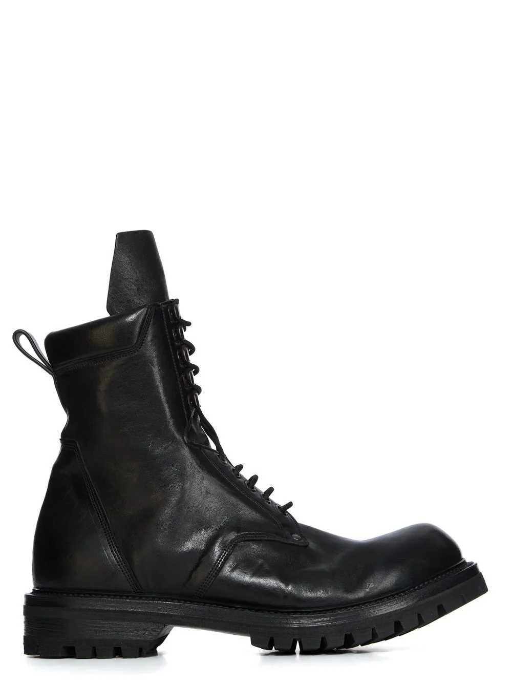 RICK OWENS FW25 CONCORDIANS ARMY LOW BOOT IN BLACK WAXY GOAT LEATHER THIS ARMY LOW BOOT IS ABOVE-ANKLE HEIGHT. THEY HAVE FRONT LACES WITH EYELETS ON THE FOOT AND LACELETS AT THE ANKLE, WITH A HIGH GEOMETRIC TONGUE. THEY FEATURE GEOMETRIC PANELS ON THE UPPER, A STITCHED HEEL COUNTER AND A LONG BACK PULL TAB. THEY HAVE A CLASSIC ARMY SOLE THIS MEDIUMWEIGHT GOAT LEATHER HAS A NATURAL GRAIN TEXTURE AND A WAXY HANDFEEL TANNED IN THE NAPLES AREA OF ITALY, THIS LEATHER IS TUMBLED MULTIPLE TIMES IN A LARGE DRUM IN ORDER TO BRING OUT THE NATURAL GRAIN TEXTURE OF THE SKIN. THE LEATHER IS FINISHED WITH NATURAL WAXES IN ORDER TO ACHIEVE THE NATURAL AND WAXY HANDFEEL BECAUSE THIS SKIN IS NAKED, NOT FINISHED USING ANY PIGMENTS COVERING THE SKIN, NATURAL MARKINGS AND SHADINGS ARE VISIBLE WHICH MAKES EACH SKIN AND PRODUCT UNIQUE VEG TANNING MEANS ONLY VEGETAL AND NATURAL TANNINS WERE USED IN THE PROCESS OF TANNING AND PRESERVING THIS LEATHER THIS TANNERY IS LWG CERTIFIED WITH A GOLD RATING COLOR: BLACK MATERIAL: UPPER 100% RAM LEATHER LINING 100% CALF LEATHER SOLE 100% RUBBER SOLE AT HEEL 3CM - SOLE AT TOE 1,5CM