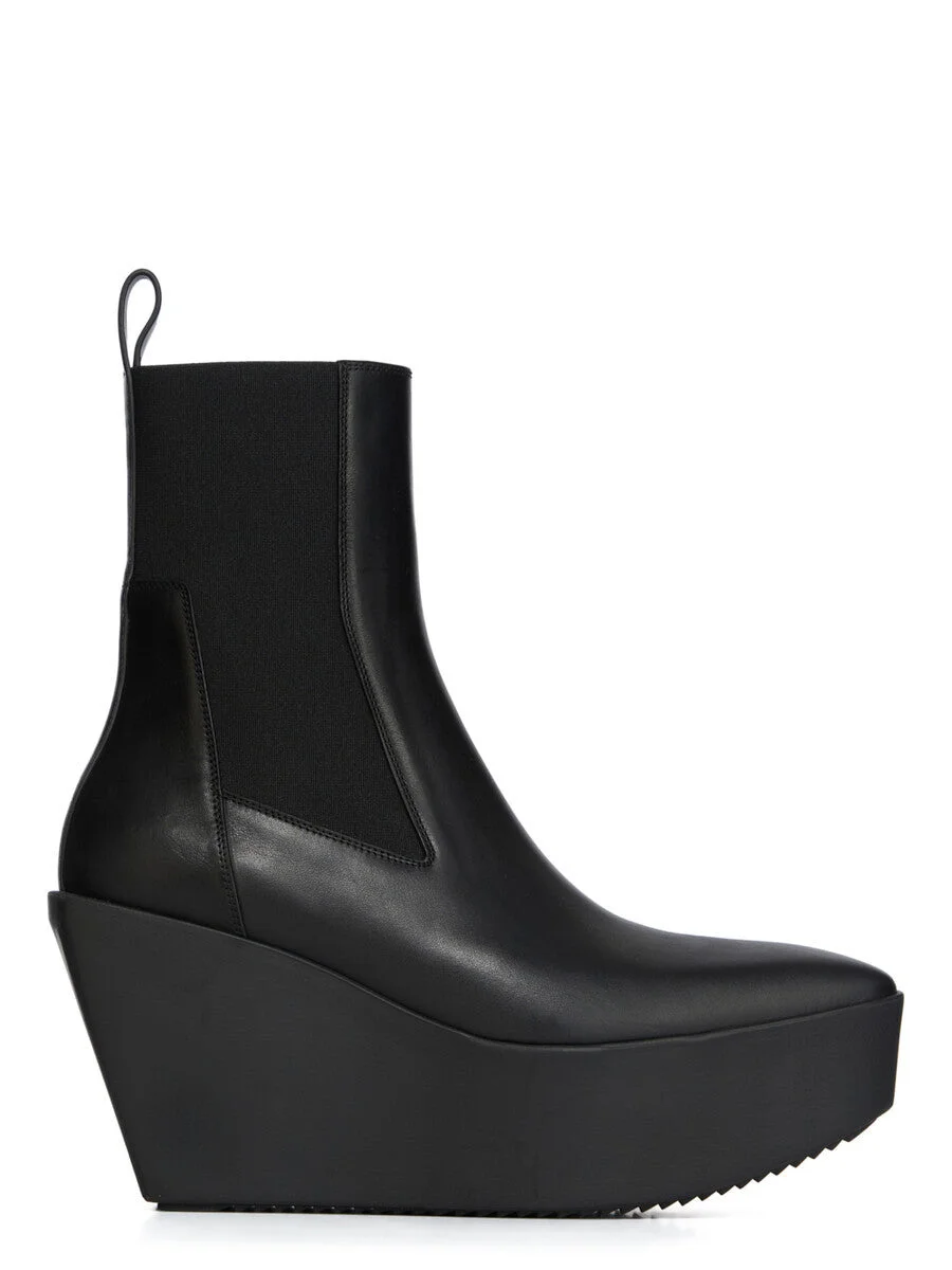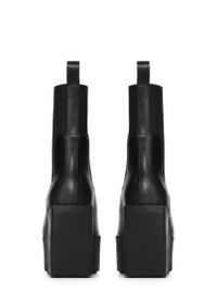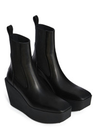 RICK OWENS FW25 CONCORDIANS SLIVER PLATFORM BEATLE IN BLACK WASHED CALF LEATHER THESE SLIVER PLATFORM BEATLES ARE ABOVE-ANKLE HEIGHT. THEY HAVE THEY HAVE A TOPSTITCHED SEAM ARCING OVER THE FRONT FOOT WITH A FLAT STRAP RUNNING OVER ON ANTERIOR ANKLE, SIDE PANELS IN STRETCH ELASTIC, AN ANGULAR HEEL COUNTER AND A BACK LOOP PULL TAB. THEY FEATURE A SOLE WITH SLANTING HEEL AND INCLINE PLATFORM WITH A SQUARE TOE. THIS MEDIUMWEIGHT COW LEATHER IS VEG TANNED AND FINISHED USING NATURAL WAXES. A FINAL WASH GIVES THIS LEATHER ITS SOFTNESS AND BRINGS OUT THE NATURAL GRAIN TEXTURE OF EACH SKIN. BECAUSE THIS SKIN IS NAKED, NOT FINISHED USING ANY PIGMENTS COVERING THE SKIN, NATURAL MARKINGS AND SHADINGS ARE VISIBLE WHICH MAKES EACH SKIN AND PRODUCT UNIQUE. VEG TANNING MEANS ONLY VEGETAL AND NATURAL TANNINS WERE USED IN THE PROCESS OF TANNING AND PRESERVING THIS LEATHER. THIS TANNERY IS LWG CERTIFIED WITH A SILVER RATING. COLOR: BLACK MATERIAL: UPPER 100% CALF LEATHER LINING 100% CALF LEATHER INSOLE 100% CALF LEATHER SOLE 100% THERMOPLASTIC RUBBER SOLE AT HEEL 11CM - SOLE AT TOE 4,5CM