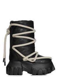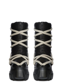 RICK OWENS FW25 CONCORDIANS LUNAR MEGA TRACTOR IN BLACK WAXY GOAT LEATHER THESE LUNAR MEGA TRACTORS ARE ABOVE-ANKLE HEIGHT. THEY HAVE A SOFT PADDED PULL ON BOOT UPPER AND DOUBLE HEIGHT, HAVE A DOUBLE HEIGHT MEGA TRACTOR SOLE. THEY ARE CROSS-CROSSED WITH JUMBO PENTA LACING THIS MEDIUMWEIGHT GOAT LEATHER HAS A NATURAL GRAIN TEXTURE AND A WAXY HANDFEEL TANNED IN THE NAPLES AREA OF ITALY, THIS LEATHER IS TUMBLED MULTIPLE TIMES IN A LARGE DRUM IN ORDER TO BRING OUT THE NATURAL GRAIN TEXTURE OF THE SKIN. THE LEATHER IS FINISHED WITH NATURAL WAXES IN ORDER TO ACHIEVE THE NATURAL AND WAXY HANDFEEL BECAUSE THIS SKIN IS NAKED, NOT FINISHED USING ANY PIGMENTS COVERING THE SKIN, NATURAL MARKINGS AND SHADINGS ARE VISIBLE WHICH MAKES EACH SKIN AND PRODUCT UNIQUE VEG TANNING MEANS ONLY VEGETAL AND NATURAL TANNINS WERE USED IN THE PROCESS OF TANNING AND PRESERVING THIS LEATHER THIS TANNERY IS LWG CERTIFIED WITH A GOLD RATING COLOR: BLACK MATERIAL: UPPER 100% RAM LEATHER LEG LINING 100% NYLON UPPER LINING 100% CALF LEATHER PADDING 100% POLYESTER INSOLE 100% CALF LEATHER SOLE 100% E.V.A SOLE AT HEEL 9CM - SOLE AT TOE 6CM