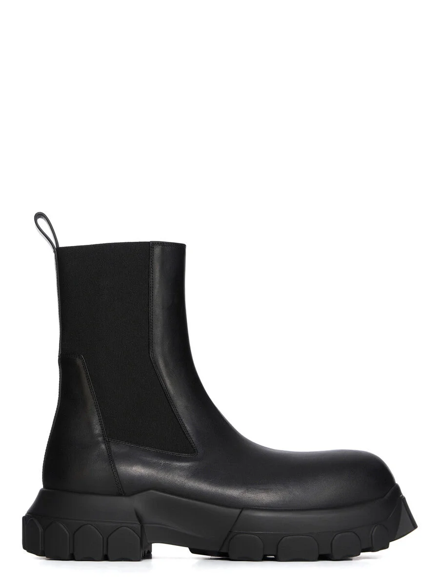 RICK OWENS FW25 CONCORDIANS BEATLE BOZO TRACTOR IN BLACK/BLACK GROPPONE COW LEATHER THESE BEATLE BOZO TRACTORS ARE ABOVE-ANKLE HEIGHT. THEY HAVE GEOMETRIC SIDE PANELS IN STRETCH ELASTIC, AN ANGULAR HEEL COUNTER WITH TOP STITCHING, A BACK LOOP PULL TAB AND A ROUNDED BOZO TOE. THEY FEATURE A TRACTOR SOLE. THIS HEAVYWEIGHT COW LEATHER IS VEG TANNED AND FINISHED USING NATURAL WAXES. BECAUSE THIS SKIN IS NAKED, NOT FINISHED USING ANY PIGMENTS COVERING THE SKIN, NATURAL MARKINGS AND SHADINGS ARE VISIBLE WHICH MAKES EACH SKIN AND PRODUCT UNIQUE. VEG TANNING MEANS ONLY VEGETAL AND NATURAL TANNINS WERE USED IN THE PROCESS OF TANNING AND PRESERVING THIS LEATHER. THIS TANNERY IS LWG CERTIFIED WITH A GOLD RATING. COLOR: BLACK/BLACK MATERIAL: UPPER 100% COW LEATHER LINING 100% CALF LEATHER INSOLE 100% CALF LEATHER SOLE 100% THERMOPLASTIC POLYURETHANE SOLE AT TOE 3CM - AT HEEL 5CM
