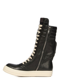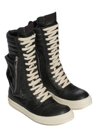 RICK OWENS SS26 TEMPLE CARGO GEOBASKET IN BLACK/MILK TUMBLED LAMB THESE CARGO GEOBASKETS ARE MID-CALF HEIGHT. THEY FEATURE AN EXTENDED TONGUE WITH WEBBING TAB, A PADDED UPPER BACK WITH LINES OF TOPSTITCHING AND A ZIPPERED CARGO POCKET. THEY HAVE FOURTEEN EYELETS WITH CONTRAST LACES, A ZIPPER ON THE INSIDE ANKLE FOR EASY FASTENING AND SHARK-TOOTHED BUMPER SOLES. THIS MEDIUMWEIGHT LAMB LEATHER IS VEG TANNED AND FINISHED WITH ANILINE. THE SURFACE TEXTURE, WHICH IS THE NATURAL GRAIN OF THE SKIN, IS ACHIEVED BY TUMBLING THE SKINS FOR 15 HOURS IN A WOODEN DRUM. VEG TANNING MEANS ONLY VEGETAL AND NATURAL TANNINS WERE USED IN THE PROCESS OF TANNING AND PRESERVING THIS LEATHER. THIS TANNERY IS LWG AUDITED. COLOR: BLACK/MILK MATERIAL:UPPER 100% LAMB LEATHER LINING 100% CALF LEATHER INSOLE 100% CALF LEATHER SOLE 100% THERMOPLASTIC RUBBER SOLE HEIGHT 3.5CM
