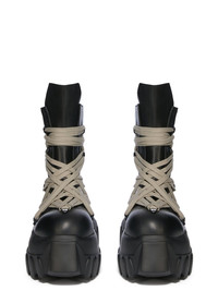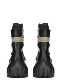 RICK OWENS SS25 HOLLYWOOD MEGALACE MEGA TRACTOR BOOTS IN BLACK/BLACK WASHED CALF THESE MEGALACE MEGA TRACTOR BOOTS ARE MID-CALF HEIGHT. THEY HAVE A HIGH GEOMETRIC TONGUE, ANGLED TOPSTITCHED PANELS, A CURVED ZIPPERS ON THE INNER AND OUTER LEGS FOR EASY FASTENING AND A PULL TAB AT BACK. THEY FEATURE SIGNATURE MEGALACE DETAIL IN A PENTAGRAM SHAPE CRISS-CROSSING THE FRONT AND HAVE A DOUBLE HEIGHT MEGA TRACTOR SOLE THIS MEDIUMWEIGHT COW LEATHER IS VEG TANNED AND FINISHED USING NATURAL WAXES. A FINAL WASH GIVES THIS LEATHER ITS SOFTNESS AND BRINGS OUT THE NATURAL GRAIN TEXTURE OF EACH SKIN. BECAUSE THIS SKIN IS NAKED, NOT FINISHED USING ANY PIGMENTS COVERING THE SKIN, NATURAL MARKINGS AND SHADINGS ARE VISIBLE WHICH MAKES EACH SKIN AND PRODUCT UNIQUE. VEG TANNING MEANS ONLY VEGETAL AND NATURAL TANNINS WERE USED IN THE PROCESS OF TANNING AND PRESERVING THIS LEATHER.THIS TANNERY IS LWG CERTIFIED WITH A SILVER RATING COLOR: BLACK/BLACK MATERIAL: UPPER 100% CALF LEATHER LINING 100% CALF LEATHER INSOLE 100% CALF LEATHER SOLE 100% E.V.A