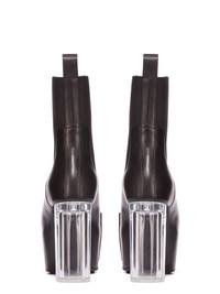 RICK OWENS FW24 PORTERVILLE GRILLED KISS 45 IN BLACK/CLEAR WASHED CALF THESE GRILLED KISS 45 ARE ABOVE-ANKLE HEIGHT. THEY HAVE ELASTIC SIDE PANELS, AN ANGLED HEEL COUNTER WITH TOPSTITCHING AND A BACK PULL-TAB. THEY FEATURE A 12CM TRANSPARENT HEEL (4,5CM RISE), A THICK COVERED FRONT PLATFORM AND A BEVELED GRILL SECURED WITH SILVER RIVETS THIS MEDIUMWEIGHT COW LEATHER IS VEG TANNED AND FINISHED USING NATURAL WAXES. A FINAL WASH GIVES THIS LEATHER ITS SOFTNESS AND BRINGS OUT THE NATURAL GRAIN TEXTURE OF EACH SKIN. BECAUSE THIS SKIN IS NAKED, NOT FINISHED USING ANY PIGMENTS COVERING THE SKIN, NATURAL MARKINGS AND SHADINGS ARE VISIBLE WHICH MAKES EACH SKIN AND PRODUCT UNIQUE. VEG TANNING MEANS ONLY VEGETAL AND NATURAL TANNINS WERE USED IN THE PROCESS OF TANNING AND PRESERVING THIS LEATHER. - COLOR: BLACK/CLEAR - MATERIAL: UPPER 100% CALF LEATHER - LINING 100% CALF LEATHER - INSOLE 100% CALF LEATHER - SOLE 100% COW LEATHER - SOLE DETAIL 100% THERMOPLASTIC POLYURETHANE