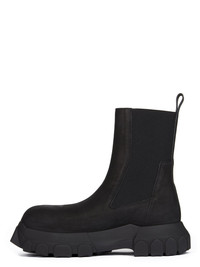 RICK OWENS FW24 PORTERVILLE BEATLE BOZO TRACTOR IN BLACK/BLACK GREYWOLF NUBUCK THESE BEATLE BOZO TRACTORS ARE ABOVE-ANKLE HEIGHT. THEY HAVE GEOMETRIC SIDE PANELS IN STRETCH ELASTIC, AN ANGULAR HEEL COUNTER WITH TOP STITCHING, A BACK LOOP PULL TAB AND A ROUNDED BOZO TOE. THEY FEATURE A TRACTOR SOLE THIS HEAVYWEIGHT BULL LEATHER HAS A BRUSHED NUBUCK FINISH AND WAXY HANDFEEL. BECAUSE THIS SKIN IS NAKED, NOT FINISHED USING ANY PIGMENTS COVERING THE SKIN, NATURAL MARKINGS AND SHADINGS ARE VISIBLE WHICH MAKES EACH SKIN AND PRODUCT UNIQUE. THIS TANNERY IS LWG CERTIFIED WITH A SILVER RATING. - COLOR: BLACK/BLACK - MATERIAL: UPPER 100% BULL LEATHER - LINING 100% CALF LEATHER - INSOLE 100% CALF LEATHER - SOLE 100% THERMOPLASTIC POLYURETHANE