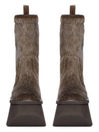 RICK OWENS FW25 CONCORDIANS RUNWAY FACTORY BOOTS IN INDIGO MELANGE UNSHAVED COW LEATHER THESE FACTORY BOOTS ARE MID-CALF HEIGHT. THEY HAVE A TOPSTITCHED SEAM ARCING OVER THE FRONT FOOT WITH STITCHING RUNNING OVER THE ANTERIOR ANKLE. THEY FEATURE AN ANGULAR HEEL COUNTER AND A BACK LOOP PULL TAB AND HAVE 14CM HIGH SHARK-TOOTH SOLE UNDERNEATH AND AT FRONT AND HAVE A SLANTING HEEL AND INCLINED TOE PLATFORM. THIS HEAVYWEIGHT LEATHER IS A HAIR-ON COWHIDE WITH NATURAL LENGTH COARSE HAIR. IT HAS BEEN TREATED WITH A CORROSION TREATMENT WHICH CREATES AN IRREGULAR INDIGO AND BROWN MELANGE COLORATION. THIS LEATHER IS TANNED IN THE VENETO AREA OF ITALY BY A TANNERY SPECIALIZED IN HAIR-ON COW LEATHER. BECAUSE THE HAIR IS NATURAL THERE CAN BE INCONSISTENCY IN THE LENGTH DIRECTION, TEXTURE AND COLOR. THIS TANNERY IS LWG CERTIFIED WITH A SILVER RATING. COLOR: INDIGO MATERIAL: UPPER 100% COW REAL FUR LINING 100% CALF LEATHER INSOLE 100% CALF LEATHER PLATFORM AT HEEL 14CM PLATFORM AT TOE 7CM