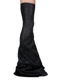 RICK OWENS FW25 CONCORDIANS CARGO FETISH SNEAKS IN BLACK LAMB LEATHER AND UNSHAVED COW LEATHER THESE CARGO FETISH SNEAKS ARE ABOVE-KNEE HIGH WITH A STRETCH LEATHER TOP. THEY HAVE A BOOT SHAPED UPPER WITH AN ADDITIONAL LAYER FALLING FROM AN ASYMMETRICAL SEAM LINE, GRAZING THE FLOOR. THEY FEATURE TWO FRONT ZIPPERS, ONE HORIZONTAL AND ON ANGLED. THEY HAVE MILK TOE CAPS AND SHARK TOOTH SOLES THIS IS A COMBINATION OF STRETCH LAMB LEATHER AND UNSHAVED COW LEATHER THIS HEAVYWEIGHT LEATHER IS A HAIR-ON COWHIDE WITH NATURAL LENGTH COARSE HAIR THIS LEATHER IS TANNED IN THE VENETO AREA OF ITALY BY A TANNERY SPECIALIZED IN HAIR-ON COW LEATHER. BECAUSE THE HAIR IS NATURAL THERE CAN BE INCONSISTENCY IN THE LENGTH DIRECTION, TEXTURE AND COLOR