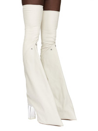 RICK OWENS FW25 CONCORDIANS RUNWAY TACO KISS IN DIRTY MILK/CLEAR STRETCH LAMB LEATHER AND FULL GRAIN CALF LEATHER THESE TACO KISS BOOTS ARE A DEFLATED VERSION OF OUR STRAYTUKAY COLLABORATION BOOTS. THEY ARE THIGH HIGH. THEY HAVE A TIGHT SOCK UPPER, JOINING TO A DIAGONAL SEAM LINE THAT SLOPES FROM MIDPOINT, OVER THE KNEE, DOWN TO THE CENTRE BACK CALF. THEY FEATURE A LEATHER UPPER THAT FLARES DOWN THE LOWER LEG, CURVING INTO THE BACK HEEL AND POINTING AT THE TOE. INSIDE THEY HAVE A 12CM CONCEALED WEDGE (6,5CM RISE) AND A THICK FRONT PLATFORM. THIS VERSION FEATURES THREE SNAPS ON FRONT, BELOW KNEE, TO ATTACH OUR INTRICATE LEATHER CHAIN MAIL, SOLD SEPARATELY THIS IS A COMBINATION OF STRETCH LAMB LEATHER AND FULL GRAIN CALF LEATHER THIS MEDIUMWEIGHT FULL GRAIN CALF LEATHER HAS A FLAT AND MATTE SURFACE FINISH AND IS SPECIFICALLY TANNED FOR SHOES WITH AN ABRASION-RESISTANT FINISH THIS TANNERY IS LWG CERTIFIED WITH A BRONZE RATING COLOR: DIRTY MILK/CLEAR MATERIAL: UPPER PART UPPER 65% LAMB LEATHER + 34% COTTON + 1% SPANDEX LOWER PART UPPER 100%COW LEATHER LINING 100% CALF LEATHER PLATFORM AT HEEL 12CM PLATFORM AT TOE 7,5CM RISE 4,5CM