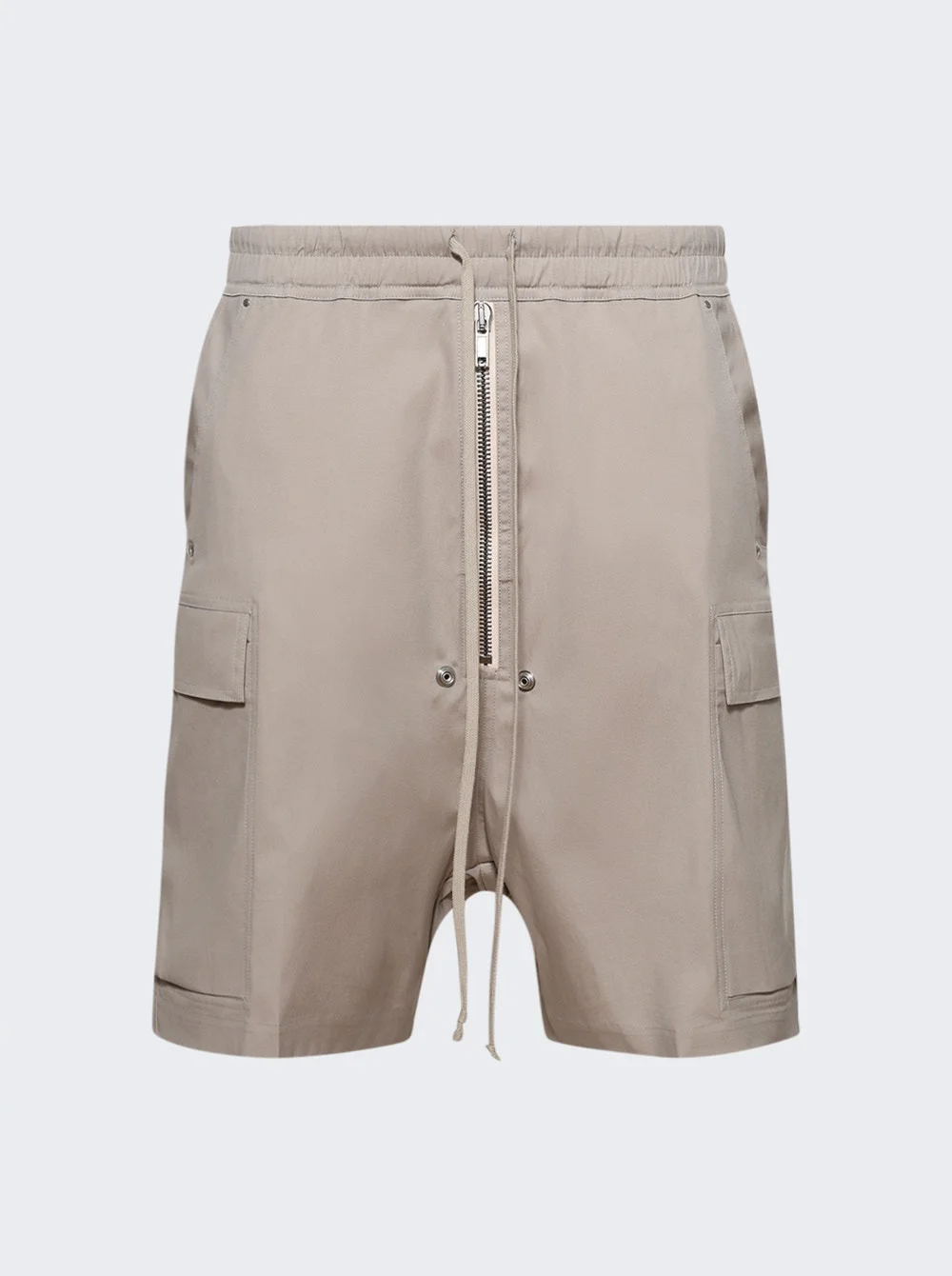Details - Cotton poplin cargo shorts - Crisp hand feel and washed finish - Knee length with a low crotch and wide leg - Elasticated waistband with drawstring - Exposed center zipper with two snap detail - Two beveled cargo pockets on the side leg - Two rear welt pockets - Material: 97% Cotton, 3% Elastane Size Information: Vendor Color Code: Brand Style: RU02E1360 TE Designer/Brand: RICK OWENS