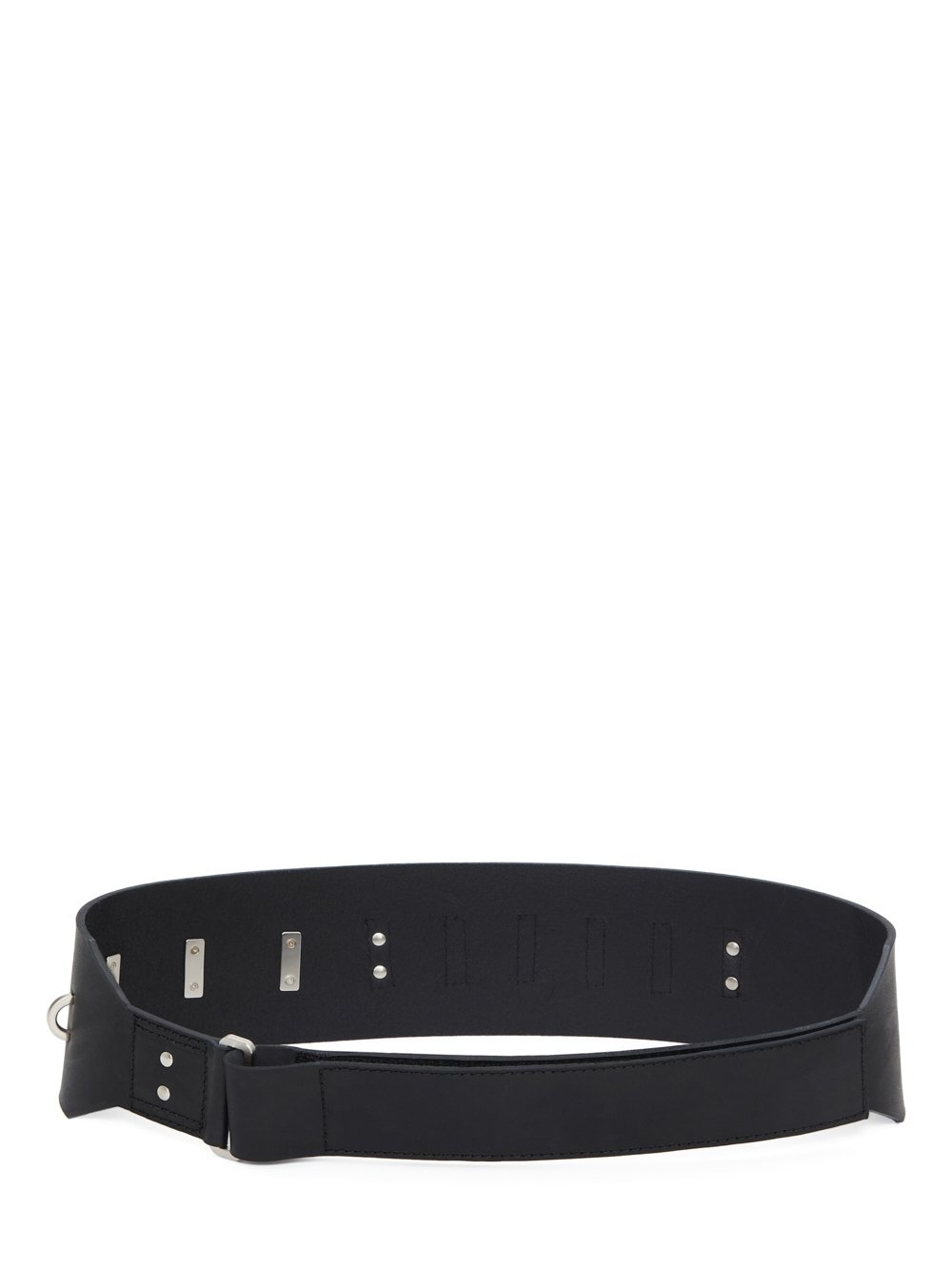 RICK OWENS FW24 PORTERVILLE CARGO BELT IN BLACK GROPPONE COW LEATHER THIS CARGO BELT IS A WIDE, RIGID BELT THAT CLOSES WITH AN ADJUSTABLE STRAP, RUNNING THROUGH A METAL LOOP. IT FEATURES RIVET DETAILS AND MULTIPLE PONTICELLO D-LOOPS. THIS BELT IS DESIGNED TO CARRY CLIP-ON OBJECTS SUCH AS THE CERBERUS HOOK THIS HEAVYWEIGHT COW LEATHER IS VEG TANNED AND FINISHED USING NATURAL WAXES. BECAUSE THIS SKIN IS NAKED, NOT FINISHED USING ANY PIGMENTS COVERING THE SKIN, NATURAL MARKINGS AND SHADINGS ARE VISIBLE WHICH MAKES EACH SKIN AND PRODUCT UNIQUE. VEG TANNING MEANS ONLY VEGETAL AND NATURAL TANNINS WERE USED IN THE PROCESS OF TANNING AND PRESERVING THIS LEATHER. THIS TANNERY IS LWG CERTIFIED WITH A GOLD RATING. - COLOR: BLACK - MATERIAL: 100% BULL LEATHER - RIBBON 100% COTTON - DETAILS 100% BRASS - MEASUREMENT: AVERAGE LENGTH 108CMMAXIMUM LENGTH 100CM / MINIMUM LENGTH 82CM