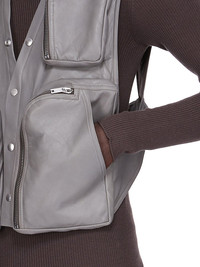 RICK OWENS FW25 CONCORDIANS CARGO VEST IN WASHED INDIGO WAXY LAMB LEATHER THIS CARGO VEST IS ABOVE HIP LENGTH AND SLEEVELESS. IT HAS A DEEP V NECK WITH THREE FUNCTIONAL VISIBLE SNAP CLOSURES, AND SNAPS CONTINUING AROUND TO THE CENTRE BACK NECK. IT FEATURES ROUNDED BAUHAUS PANNIER POCKETS WITH ZIPS, TWO LARGE ON THE SIDE BODY, AND 2 SMALLER ONES EITHER SIDE OF THE CHEST. IT HAS LEVEL SHOULDER SEAMS AND AN OPEN BACK THAT SECURES WITH A CENTRE SNAP BELT THIS LIGHTWEIGHT LAMB LEATHER IS FINISHED USING NATURAL WAXES AND ANILINE WHICH MAKES A SUPPLE HANDFEEL BECAUSE THIS SKIN IS NAKED, NOT FINISHED USING ANY PIGMENTS COVERING THE SKIN, NATURAL MARKINGS AND SHADINGS ARE VISIBLE WHICH MAKES EACH SKIN AND PRODUCT UNIQUE THIS TANNERY IS LWG AUDITED COLOR: WASHED INDIGO MATERIAL: 100% LAMB LEATHER LINING 100% COTTON PADDING 100% POLYESTER MODEL IS 189CM TALL MODEL WEARS SIZE 48