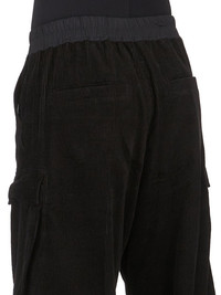 RICK OWENS FW25 CONCORDIANS CARGOBELAS IN BLACK LINEN CORDUROY THESE CARGOBELAS PANTS ARE FULL-LENGTH WITH A LOW CROTCH AND WIDE LEG. THEY FEATURE AN ELASTICIZED WAISTBAND WITH DRAWSTRING AND A BELA EXPOSED CENTER ZIPPER WITH TWO SNAP DETAIL AT BOTTOM. THEY HAVE SIDE WELT POCKETS WITH RIVET AND EYELET DETAIL, FOUR BEVELED CARGO POCKETS ON THE SIDE LEG AND TWO REAR WELT POCKETS WITH CONCEALED SNAPS AND TOPSTITCHING THIS MEDIUMWEIGHT COTTON AND LINEN BLEND CORDUROY HAS A SOFT HANDFEEL THIS FABRIC IS MADE USING GOTS CERTIFIED ORGANIC COTTON WHICH MEANS THE NATURAL FIBER IS GROWN WITHOUT HARMFUL CHEMICALS, LEAVING OUR SOIL, AIR AND WATER CLEANER FROM CONTAMINATES COLOR: BLACK MATERIAL: 74% COTTON + 26% LINEN BUTTONS 100% BUFFALO HORN MODEL IS 189CM TALL MODEL WEARS SIZE 48