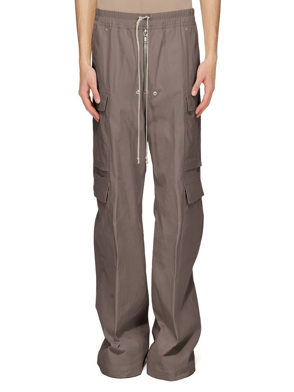 RICK OWENS SS25 HOLLYWOOD TAILORED BELAS IN DUST HEAVY COTTON POPLIN THESE TAILORED BELAS ARE FULL-LENGTH WITH A LOW CROTCH AND WIDE LEG. THEY FEATURE A WAISTBAND WITH BELT LOOPS, RIVETS AND A CONCEALED BUTTON FLY WITH TWO SNAPS AT BOTTOM. THEY HAVE SIDE WELT POCKETS WITH RIVET AND EYELET DETAIL AND TWO REAR WELT POCKETS WITH SNAPS AND TOPSTITCHING THIS MEDIUMWEIGHT COTTON POPLIN HAS A CRISP HANDFEEL AND WASHED FINISH THIS FABRIC IS MADE USING GOTS CERTIFIED ORGANIC COTTON WHICH MEANS THE NATURAL FIBER IS GROWN WITHOUT HARMFUL CHEMICALS, LEAVING OUR SOIL, AIR AND WATER CLEANER FROM CONTAMINATES COLOR: DUST MATERIAL: 97% COTTON + 3% ELASTANE MODEL IS 189CM TALL MODEL WEARS SIZE 48