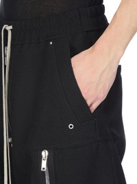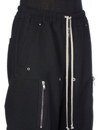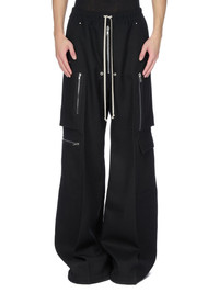 RICK OWENS FW25 CONCORDIANS CARGOBELAS IN BLACK WOOL DRILL THESE CARGOBELAS PANTS ARE FULL-LENGTH WITH A LOW CROTCH AND WIDE LEG. THEY FEATURE AN ELASTICIZED WAISTBAND WITH DRAWSTRING AND A BELA EXPOSED CENTER ZIPPER WITH TWO SNAP DETAIL AT BOTTOM. THEY HAVE SIDE WELT POCKETS WITH RIVET AND EYELET DETAIL, FOUR BEVELED CARGO POCKETS ON THE SIDE LEG AND TWO REAR WELT POCKETS WITH CONCEALED SNAPS AND TOPSTITCHING THIS MEDIUMWEIGHT WOOL DRILL FABRIC HAS A DISTINCT DRILL TEXTURE AND A DRY HANDFEEL THIS FABRIC IS MADE FROM RWS CERTIFIED VIRGIN WOOL WHICH ENSURES A HIGH STANDARD IN ANIMAL WELFARE, ENVIRONMENTAL SUSTAINABILITY AND SOCIAL RESPONSIBILITY. EACH BALE OF WOOL IS TRACEABLE BACK TO ITS SOURCE COLOR: BLACK MATERIAL: 100% VIRGIN WOOL MODEL IS 189CM TALL MODEL WEARS SIZE 48
