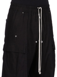 RICK OWENS FW25 CONCORDIANS CARGOBELAS IN BLACK WOOL FLANNEL THESE CARGOBELAS PANTS ARE FULL-LENGTH WITH A LOW CROTCH AND WIDE LEG. THEY FEATURE AN ELASTICIZED WAISTBAND WITH DRAWSTRING AND A BELA EXPOSED CENTER ZIPPER WITH TWO SNAP DETAIL AT BOTTOM. THEY HAVE SIDE WELT POCKETS WITH RIVET AND EYELET DETAIL, FOUR BEVELED CARGO POCKETS ON THE SIDE LEG AND TWO REAR WELT POCKETS WITH CONCEALED SNAPS AND TOPSTITCHING THIS LIGHTWEIGHT WOOL AND COTTON BLEND FLANNEL HAS A SOFT AND BRUSHED HANDFEEL THIS FABRIC IS MADE USING GOTS CERTIFIED ORGANIC COTTON AND RWS CERTIFIED WOOL COLOR: BLACK MATERIAL: 81% COTTON + 19% WOOL MODEL IS 189CM TALL MODEL WEARS SIZE 48