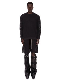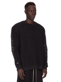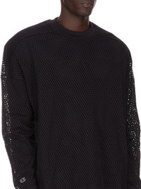 CHAMPION X RICK OWENS SS25 JUMBO SWEAT IN BLACK OPEN MESH JERSEY IT FEATURES A 3D EMBROIDERED SIGNATURE CHAMPION X RICK OWENS CHAMPION LOGO ON RIGHT WRIST. THIS MEDIUMWEIGHT OPEN MESH JERSEY IS KNITTED ON A SPECIALISED MACHINE THAT LEAVE LARGE OPENINGS IN THE JERSEY. IT HAS A DRY HANDFEEL. THIS JERSEY IS MADE USING CERTIFIED ORGANIC COTTON WHICH MEANS THE NATURAL FIBER IS GROWN WITHOUT HARMFUL CHEMICALS, LEAVING OUR SOIL, AIR AND WATER CLEANER FROM CONTAMINATES. COLOR: BLACK MATERIAL: 100% COTTON MODEL WEARS SIZE M MODEL IS 189CM TALL