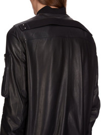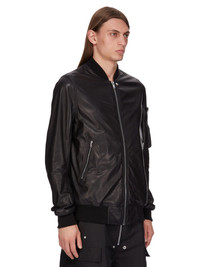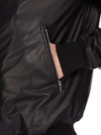RICK OWENS SS25 HOLLYWOOD CLASSIC FLIGHT IN BLACK WAXY LAMB LEATHER THIS CLASSIC FLIGHT IS HIP LENGTH WITH LONG SLEEVES. IT HAS A CENTER FRONT ZIPPER WITH PLACKET AND TOP SNAP. IT ALSO HAS SIDE FRONT SLIT POCKETS SNAPS, A ZIPPERED UTILITY POCKET IN THE LEFT FOREARM AND A RIBBED COLLAR, CUFFS AND HEM. IT FEATURES A COTTON WEBBING STRAP WITH RIVET DETAIL ON THE BACK YOKEIT IS FULLY LINED AND HAS TWO INTERNAL ZIPPERED POCKETS THIS LIGHTWEIGHT LAMB LEATHER IS FINISHED USING NATURAL WAXES AND ANILINE WHICH MAKES A SUPPLE HANDFEEL. BECAUSE THIS SKIN IS NAKED, NOT FINISHED USING ANY PIGMENTS COVERING THE SKIN, NATURAL MARKINGS AND SHADINGS ARE VISIBLE WHICH MAKES EACH SKIN AND PRODUCT UNIQUE.THIS TANNERY IS LWG AUDITED COLOR: BLACK MATERIAL: 100% LAMB LEATHER KNIT RIB COLLAR WRIST BAND AND BOTTOM 100% NEW WOOL FRONT AND POCKETS LINING 100% COTTON BACK AND SLEEVES LINING 100% CUPRO MODEL IS 189CM TALL MODEL WEARS SIZE 48