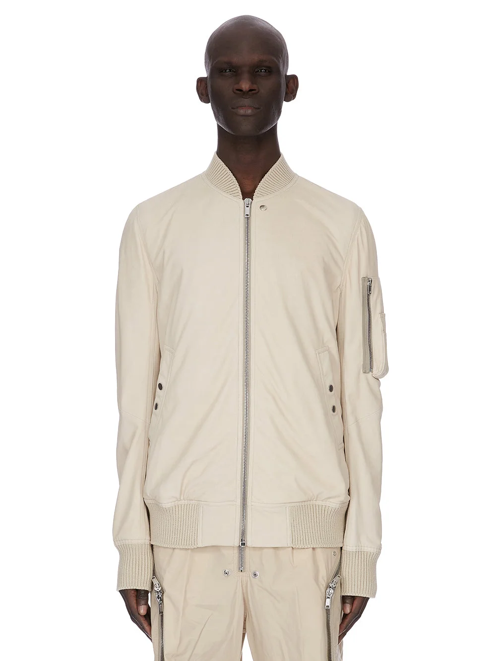 RICK OWENS SS26 TEMPLE CLASSIC FLIGHT IN SAND FEATHER NAPPA THIS CLASSIC FLIGHT IS HIP LENGTH WITH LONG SLEEVES. IT HAS A CENTER FRONT ZIP WITH PLACKET AND TOP SNAP, SIDE FRONT SLIT POCKETS SNAPS, A ZIPPED UTILITY POCKET IN THE LEFT FOREARM AND A RIBBED COLLAR, CUFFS AND HEM. IT FEATURES A COTTON WEBBING STRAP WITH RIVET DETAIL ON THE BACK YOKE. IT IS FULLY LINED WITH TWO INTERNAL ZIPPED POCKETS. THIS LIGHTWEIGHT LAMB LEATHER IS MATTE AND SMOOTH WITH A SOFT AND FLUID HANDFEEL. THIS LEATHER IS MADE BY A THIRD GENERATION FAMILY OWNED TANNERY IN THE SOUTH OF ITALY. COLOR: SAND MATERIAL:100% LAMB LEATHER KNIT RIB COLLAR, WRIST BAND AND BOTTOM 92% NEW WOOL + + 6% NYLON + 2% ELASTANE BODY AND POCKETS LINING 100% COTTOSLEEVES LINING 100% CUPRO MODEL IS 189CM TALL MODEL WEARS SIZE 48