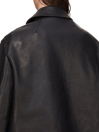 RICK OWENS FW25 CONCORDIANS RUNWAY BLIXA JUMBO MAC IN BLACK WASHED CALF LEATHER AND MELTON THIS BLIXA JUMBO MAC IS BELOW KNEE LENGTH WITH LONG SLEEVES AND A SQUARE FIT. IT HAS A CLASSIC COLLAR AND A CENTRE ZIPPER OPENING, BLIXA TWO-WAY ZIPPERED CHEST POCKETS AND TWO LOWER FLAP POCKETS ON FRONT AS WELL AS THE HARNESS DETAIL ON FRONT CHEST. IT FEATURES THE IT FEATURES A ZIP HEM, ALLOWING PIECES TO BE CONVERTED INTO LONGER OR SHORTER GARMENTS. THIS BLIXA JUMBO MAC IS COAT LENGTH BUT CAN BE UNZIPPED INTO A CROPPED PIECE. THE ZIPS CAN ALSO BE PARTIALLY UNDONE, ALLOWING THE BOTTOM HALF TO DRAPE BEHIND. IT HAS A CENTRE BACK VENT. IT IS FULLY LINED WITH TWO INTERNAL ZIPPERED POCKETS. THIS VERSION HAS CONTRAST LEATHER TOP AND VIRGIN WOOL LOWER HALF THIS IS A COMBINATION OF WASHED CALF LEATHER AND MELTON THIS HEAVYWEIGHT COW LEATHER IS VEG TANNED AND FINISHED USING NATURAL WAXES. A FINAL WASH GIVES THIS LEATHER ITS SOFTNESS AND BRINGS OUT THE NATURAL GRAIN TEXTURE OF EACH SKIN. BECAUSE THIS SKIN IS NAKED, NOT FINISHED USING ANY PIGMENTS COVERING THE SKIN, NATURAL MARKINGS AND SHADINGS ARE VISIBLE WHICH MAKES EACH SKIN AND PRODUCT UNIQUE VEG TANNING MEANS ONLY VEGETAL AND NATURAL TANNINS WERE USED IN THE PROCESS OF TANNING AND PRESERVING THIS LEATHER THIS TANNERY IS LWG CERTIFIED WITH A SILVER RATING COLOR: BLACK MATERIAL: UPPER BODY AND SLEEVES 100% CALF LEATHERLOWER BODY 100% NEW WOOL BODY AND POCKETS LINING 100% COTTON MODEL IS 189CM TALL MODEL WEARS SIZE 46