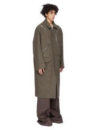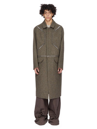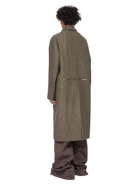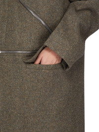 RICK OWENS FW25 CONCORDIANS RUNWAY BLIXA JUMBO MAC IN BOSCO RUGGED WOOL THIS BLIXA JUMBO MAC IS BELOW KNEE LENGTH WITH LONG SLEEVES AND A SQUARE FIT. IT HAS A CLASSIC COLLAR AND A CENTRE ZIPPER OPENING, BLIXA TWO-WAY ZIPPERED CHEST POCKETS AND TWO LOWER FLAP POCKETS ON FRONT. IT FEATURES A ZIP HEM, ALLOWING PIECES TO BE CONVERTED INTO LONGER OR SHORTER GARMENTS. THIS BLIXA JUMBO MAC IS COAT LENGTH BUT CAN BE UNZIPPED INTO A CROPPED PIECE. THE ZIPS CAN ALSO BE PARTIALLY UNDONE, ALLOWING THE BOTTOM HALF TO DRAPE BEHIND. IT HAS A CENTRE BACK VENT. IT IS FULLY LINED WITH TWO INTERNAL ZIPPERED POCKETS THIS HEAVYWEIGHT AND RUGGED WOOL MELTON IS COMPACT WITH A DRY HANDFEEL IT IS MADE FROM BRITISH WOOL BLENDED WITH KEMP, ALSO KNOWN AS DEAD HAIR. KEMP FIBERS ARE NATURAL TO SOME SHEEP BREEDS AND DO NOT TAKE DYE COLOR: BOSCO MATERIAL: 100% WOOL BODY AND POCKETS LINING 100% COTTON SLEEVES LINING 100% CUPRO MODEL IS 189CM TALL MODEL WEARS SIZE 46