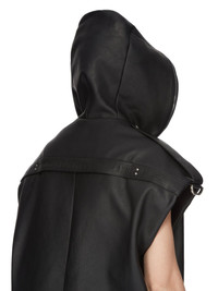 RICK OWENS SS24 LIDO RUNWAY LIDO SLEEVELESS HOODIE IN BLACK OILY CALF THIS LIDO SLEEVELESS HOODIE IS BELOW HIP LENGTH WITH A JUMBO FIT. IT IS SLEEVELESS WITH WIDE SHOULDERS, SIGNATURE LEVEL SHOULDER SEAMS WITH EPAULETTES AND D-RING DETAIL. IT HAS A CENTRE FRONT ZIPPER OPENING WITH A SLIM PLACKET THAT RUNS FROM THE HEM ALL THE WAY UP THROUGH THE HOOD, ALLOWING IT TO BE ZIPPED COMPLETELY CLOSED OVER THE FACE. IT FEATURES TWO FOG BREAST POCKETS WITH A VERTICAL OPENING AND INTERNAL SNAPS, AND TWO SIDE SEAM POCKETS. IT HAS A BACK YOKE WITH LEATHER BACKSTRAP AND RIVET DETAILIT IS FULLY LINED AND HAS TWO INTERNAL ZIPPERED POCKETSTHIS HEAVYWEIGHT AND OILY CALF LEATHER IS VEG TANNED AND FINISHED USING NATURAL WAXES WHICH MAKES A SUPPLE AND OILY HANDFEEL. BECAUSE THIS SKIN IS NAKED, NOT FINISHED USING ANY PIGMENTS COVERING THE SKIN, NATURAL MARKINGS AND SHADINGS ARE VISIBLE WHICH MAKES EACH SKIN AND PRODUCT UNIQUE. VEG TANNING MEANS ONLY VEGETAL AND NATURAL TANNINS WERE USED IN THE PROCESS OF TANNING AND PRESERVING THIS LEATHER.THIS TANNERY IS LWG CERTIFIED WITH A GOLD RATING. - COLOR: BLACK - MATERIAL: 100% CALF LEATHER - FRONT + HOOD LINING + POCKETS 100% COTTON - BACK LINING 53% VISCOSE + 47% CUPRO - PADDING 100% POLYESTER - MODEL IS 189CM TALL - MODEL WEARS SIZE 48
