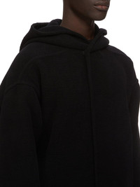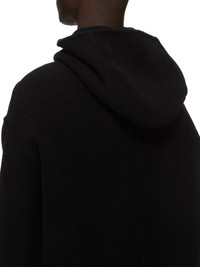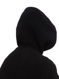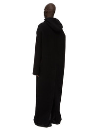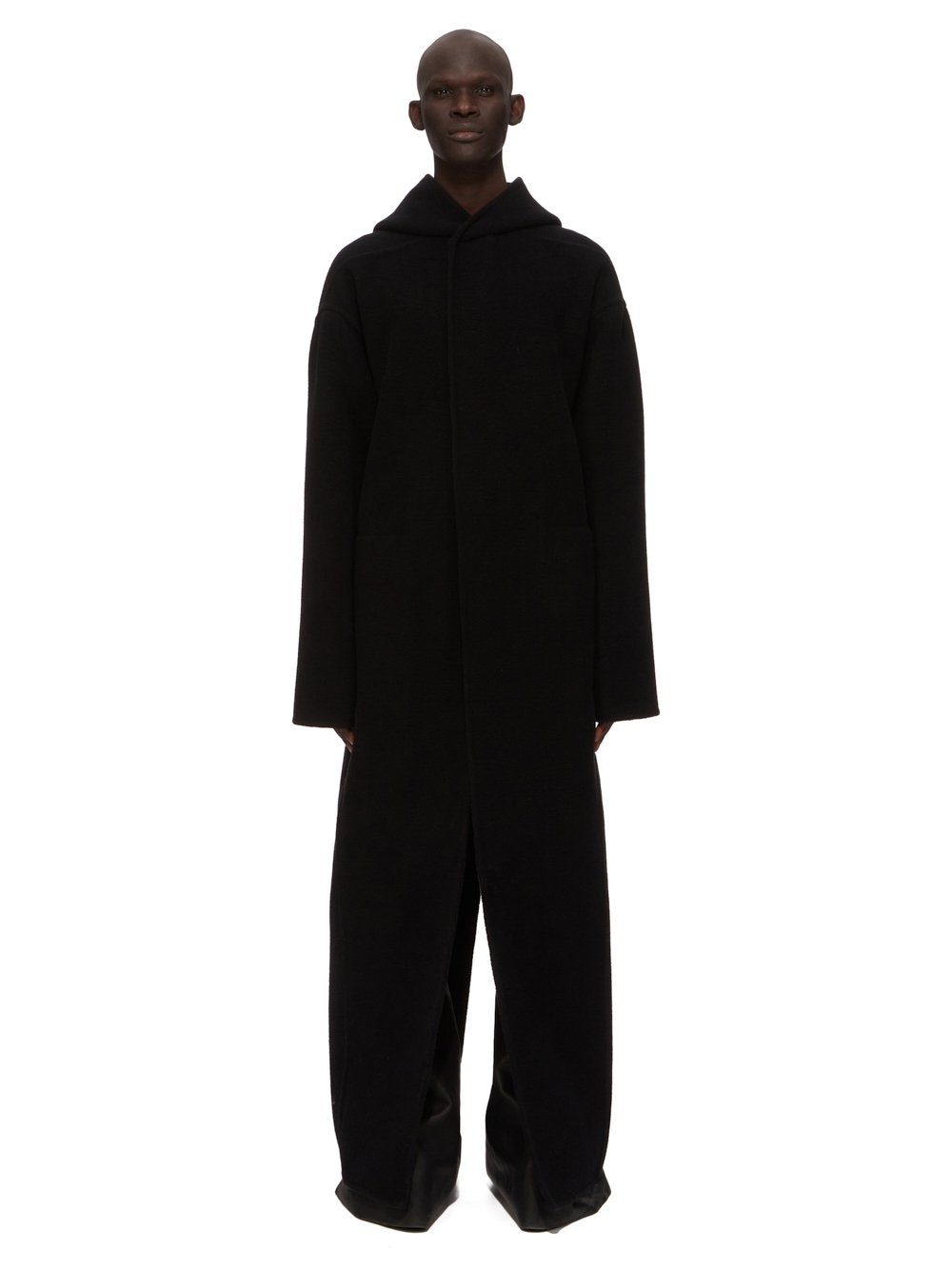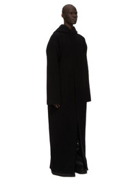 RICK OWENS FW24 PORTERVILLE RUNWAY HOODED ROBE LONG IN BLACK DOUBLE CASHMERE THIS HOODED ROBE LONG IS FLOOR LENGTH, WITH LONG LOOSE SLEEVES. IT HAS AN OPEN FRONT THAT WRAPS OVER, AND SECURES WITH ONE SNAP AT THE FRONT NECK. IT HAS A LARGE HOOD, LEVEL SHOULDER SEAMS AND CONCEALED SIDE SEAM POCKETS THIS HEAVYWEIGHT PURE CASHMERE QUALITY IS WOVEN ON A DOUBLE WARP IN ORDER TO ACHIEVE ITS HEAVINESS AND CREATE A DOUBLE-FACED FABRIC. THE FINISHED ROLL IS THEN WASHED TO ADD SOFTNESS AND TEXTURE.THIS PRODUCT WAS MADE USING GRS CERTIFIED RECYCLED CASHMERE BECAUSE IT FINDS A PURPOSE FOR RAW MATERIALS THAT WOULD OTHERWISE BE DISCARDED. - COLOR: BLACK - MATERIAL: 100% CASHMERE - POCKETS LINING 100% COTTON