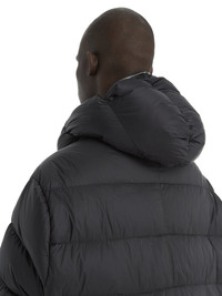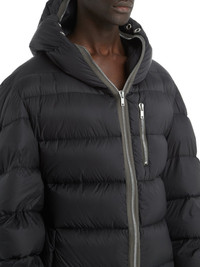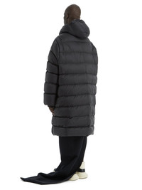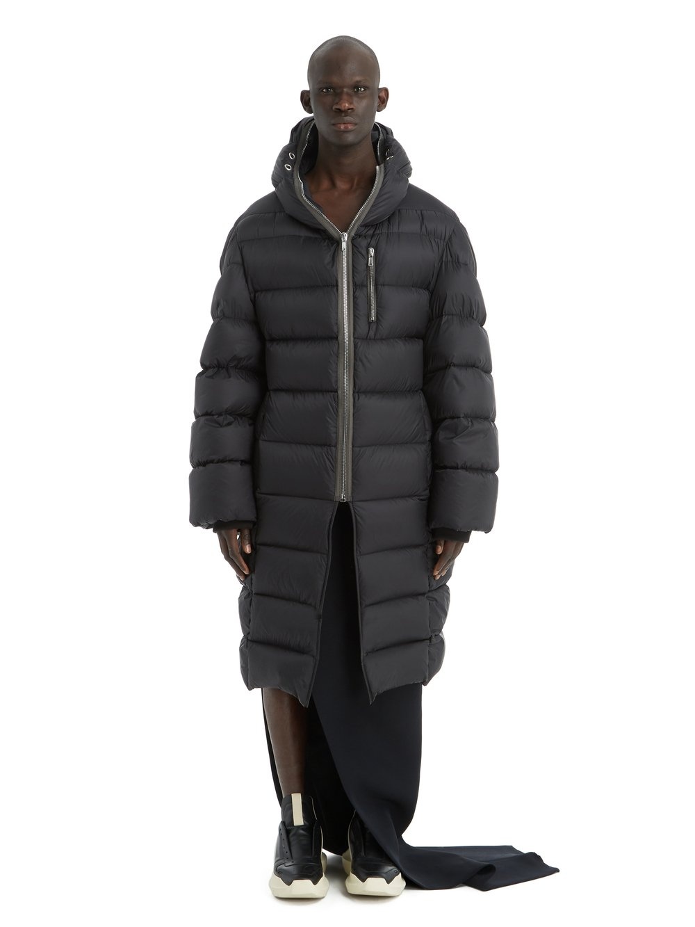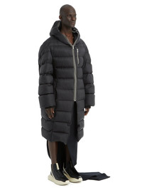 RICK OWENS FW22 STROBE RUNWAY JUMBO GIMP COAT IN BLACK LIGHTWEIGHT NYLON THIS JUMBO GIMP COAT IS KNEE LENGTH WITH LONG SLEEVES WITH RIBBED CUFF. IT FEATURES A HOOD WITH A CENTRE FRONT ZIPPER WHICH CAN BE WORN CLOSED ALL THE WAY UP OVER THE FACE. IT HAS SLITS FOR EYE OPENINGS AND FOUR METAL EYELETS FOR VENTILATION. IT HAS A ZIPPERED POCKET ON THE LEFT CHEST AND SIDE BODY SLIT POCKETS WITH INTERNAL SNAPS AND THREE INSIDE POCKETS THIS MATERIAL IS A LIGHTWEIGHT PARACHUTE NYLON - COLOR: BLACK - MATERIAL: 100% NYLON - KNIT RIB CUFF 100% NEW WOOL - POCKETS LINING 100% COTTON - PADDING 90% GOOSE DOWN + 10% MALLARD FEATHERS - MODEL IS WEARING SIZE 48 - MODEL IS 189CM TALL