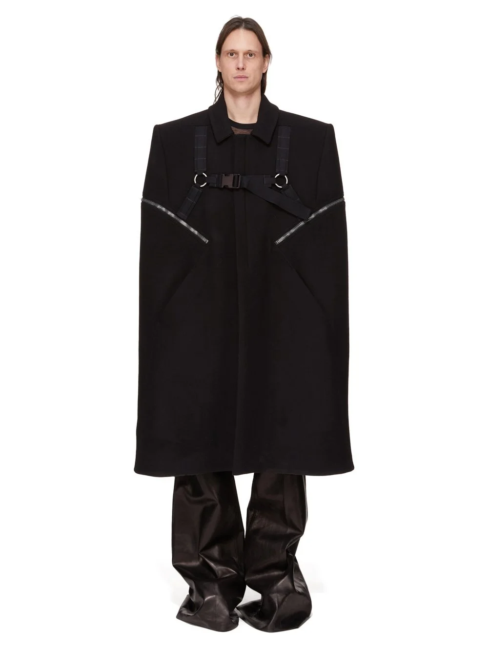 RICK OWENS FW25 CONCORDIANS RUNWAY BLIXA CAPE IN BLACK MELTON THIS BLIXA CAPE IS BELOW KNEE LENGTH AND SLEEVELESS. IT HAS A CONCEALED CENTRE FRONT ZIPPER AND FITS COMFORTABLY OVER THE SHOULDERS. ITS FRONT HARNESS AND CLIP ENSURE IT HOLDS IN PLACE. IT FEATURES TWO-WAY, ABOVE-ELBOW, BLIXA ZIPPERS, THAT GO FROM FRONT TO BACK. WHEN UNZIPPED THE ARMS CAN BE FREED FROM INSIDE THE CAPE. IT HAS SIDE POCKETS AND IS FULLY LINED AND HAS INTERNAL ZIPPERED POCKETS. THIS HEAVYWEIGHT AND COMPACT WOOL MELTON HAS A FLAT, MATTE FINISH AND A SOFT HANDFEEL COLOR: BLACK MATERIAL: 100% NEW WOOL MODEL IS 189CM TALL MODEL WEARS SIZE 48