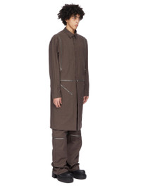 RICK OWENS FW25 CONCORDIANS BONOTTO CAPSULE HEIZER LONG OUTERSHERT IN ASH COTTON WHIPCORD. THIS HEIZER LONG OUTERSHIRT IS KNEE LENGTH WITH LONG SLEEVES. IT HAS A CLASSIC COLLAR, CONCEALED CENTRE SNAP CLOSURES, AND TWO-WAY SHOULDER ZIPPERS THAT CAN BE WORN PARTIALLY ZIPPED DOWN TO REVEAL THE ARM. IT FEATURES FRONT ZIPPERED POCKETS AND A ZIP HEM, ALLOWING PIECES TO BE CONVERTED INTO LONGER OR SHORTER GARMENTS. THIS HEIZER LONG OUTERSHIRT CAN BE UNZIPPED INTO A CROPPED PIECE. THE ZIPS CAN ALSO BE PARTIALLY UNDONE, ALLOWING THE BOTTOM HALF TO DRAPE BEHIND. IT IS FULLY LINED WITH TWO INTERNAL ZIPPERED POCKETS AND A BACK VENT. THIS ITEM IS PART OF THE RICK OWENS BONOTTO CAPSULE COLLECTION AND FEATURES A SIGNATURE LABEL ON THE INTERIOR. THIS MEDIUMWEIGHT COTTON WHIPCORD HAS A VISIBLE TWILL STRUCTURE AND A DRY HANDFEEL. IT IS MADE USING RAW COTTON YARNS MEANING IRREGULAR SLUBS ARE VISIBLE THROUGHOUT THE WEAVE. THE FABRIC HAS MINIMAL FINISHING IN ORDER TO KEEP THE NATURAL CHARACTERISTICS OF THE COTTON YARN. THIS FABRIC WAS WOVEN ON A 1950’S VINTAGE SHUTTLE LOOM BY BONOTTO, A 4TH GENERATION TEXTILE MILL FOUNDED IN 1912 SITUATED JUST BELOW THE PREALPS IN VENETO, ITALY. COLOR: ASH MATERIAL: 100% COTTON MODEL IS 189CM TALL MODEL WEARS SIZE 46