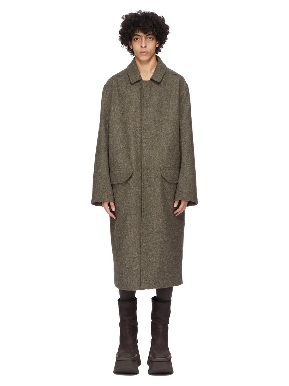 RICK OWENS FW25 CONCORDIANS RUNWAY JUMBO MAC IN BOSCO RUGGED WOOL THIS JUMBO MAC IS BELOW KNEE LENGTH WITH LONG SLEEVES AND AN AMPLE FIT. IT HAS A CLASSIC COLLAR AND A CONCEALED CENTRE ZIPPER OPENING, AND TWO LOWER FLAP POCKETS ON FRONT. IT HAS A CENTRE BACK VENT AND IS FULLY LINED WITH TWO INTERNAL ZIPPERED POCKETS THIS HEAVYWEIGHT AND RUGGED WOOL MELTON IS COMPACT WITH A DRY HANDFEEL IT IS MADE FROM BRITISH WOOL BLENDED WITH KEMP, ALSO KNOWN AS DEAD HAIR. KEMP FIBERS ARE NATURAL TO SOME SHEEP BREEDS AND DO NOT TAKE DYE COLOR: BOSCO MATERIAL:100% WOOL MODEL IS 189CM TALL MODEL WEARS SIZE 46