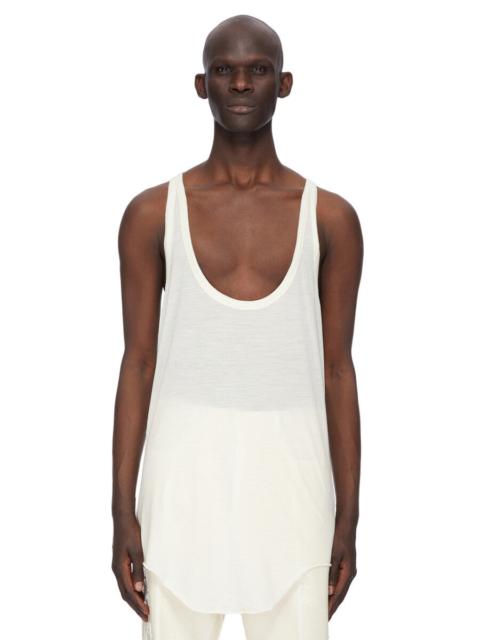 RICK OWENS FW25 CONCORDIANS RUNWAY PONY TANK IN BLACK SILK WOOL JERSEY THIS PONY TANK IS BELOW HIP LENGTH. IT HAS A LOW SCOOP FRONT, A SLIGHT RACER BACK AND A ROUNDED RAW CUT HEM THAT DIPS IN FRONT AND BACK. THIS LIGHTWEIGHT SILK AND WOOL BLEND JERSEY HAS A SOFT HANDFEEL AND SEMI SHINY SURFACE. THIS JERSEY IS MADE FROM RWS CERTIFIED VIRGIN WOOL WHICH ENSURES A HIGH STANDARD IN ANIMAL WELFARE, ENVIRONMENTAL SUSTAINABILITY AND SOCIAL RESPONSIBILITY. EACH BALE OF WOOL IS TRACEABLE BACK TO ITS SOURCE. WE STRIVE TO KEEP OUR PRODUCTION AS LOCAL AS POSSIBLE. THE FULL MANUFACTURING CYCLE OF THIS PRODUCT, FROM THE MATERIAL KNITTING TO SEWING AND FINISHING, WAS UNDERTAKEN CLOSE TO OUR HOME BASE IN CONCORDIA, ITALY. COLOR: BLACK MATERIAL: 70% NEW WOOL + 30% SILK MODEL IS 189CM TALL MODEL WEARS SIZE S